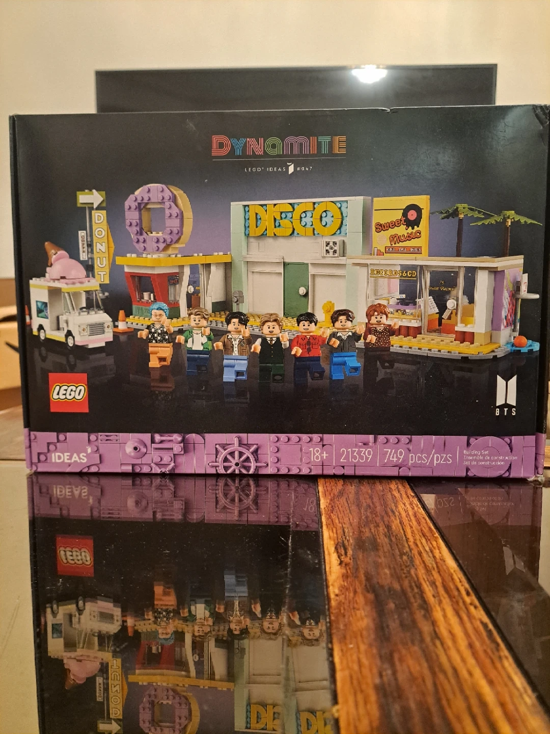 This is the LEGO Ideas BTS Dynamite set, number 21339. It includes 749 pieces. It's designed for ages 18+ and recreates scenes from the Dynamite music video. Build the iconic donut shop, disco, and ice cream truck.