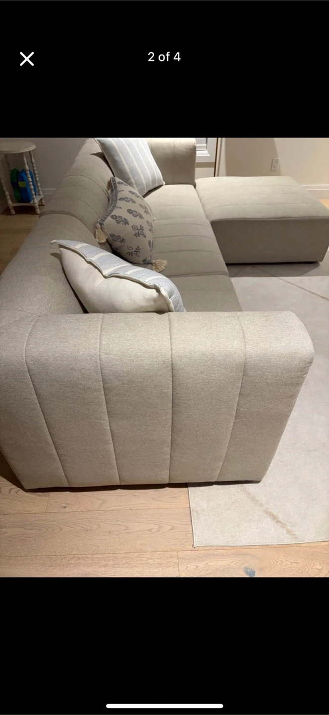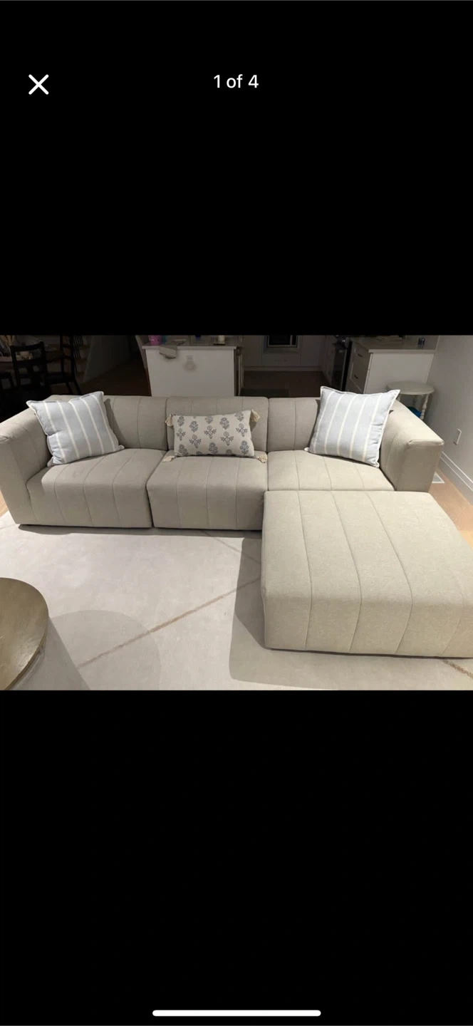 Comfortable light beige sectional sofa. Includes a large matching ottoman. Upholstered in a durable fabric, it's perfect for a living room or den. The modular design offers flexible arrangement options.