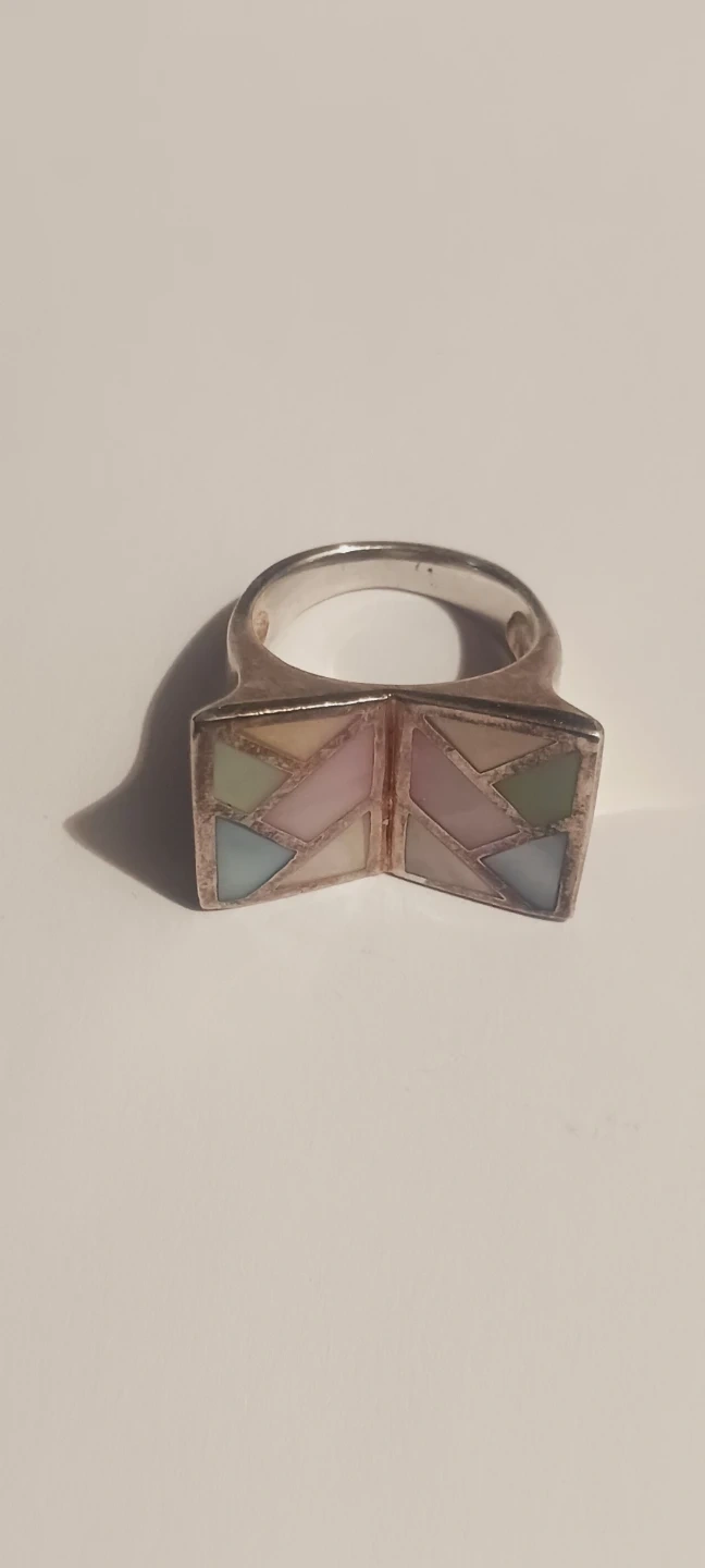 Sterling Silver 925 vintage ring featuring unique geometric inlay design. It's crafted with colorful pastel stones set in a sterling silver. A stylish statement piece for any jewelry collection! Size 6. Excellent condition. ALL MY PRICES ARE NEGOTIABLE !!