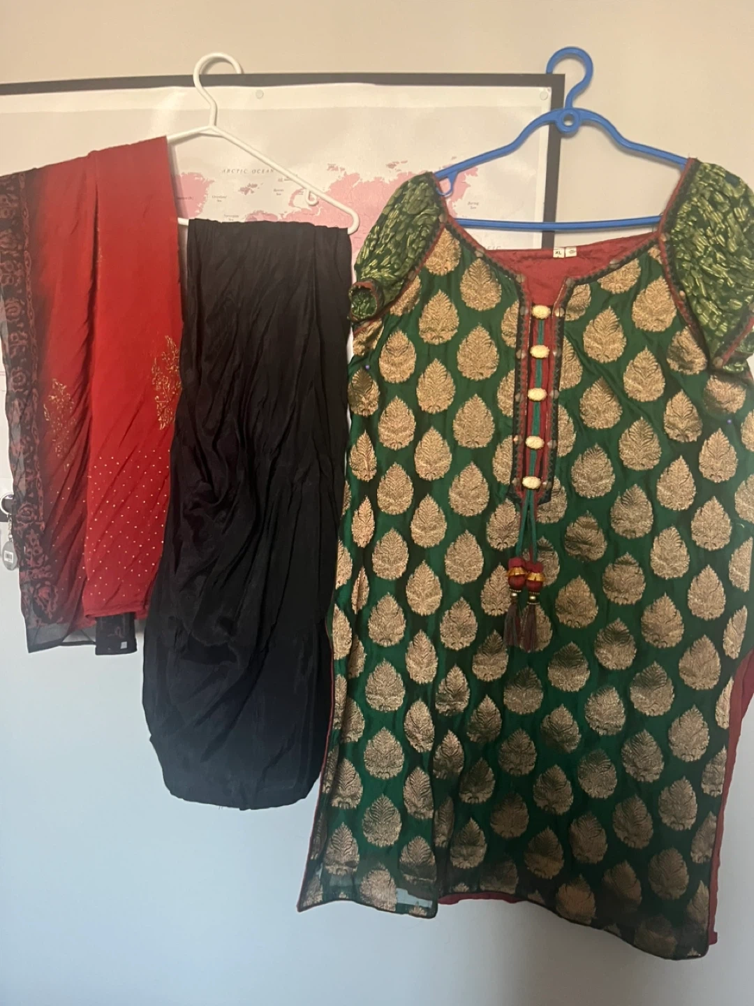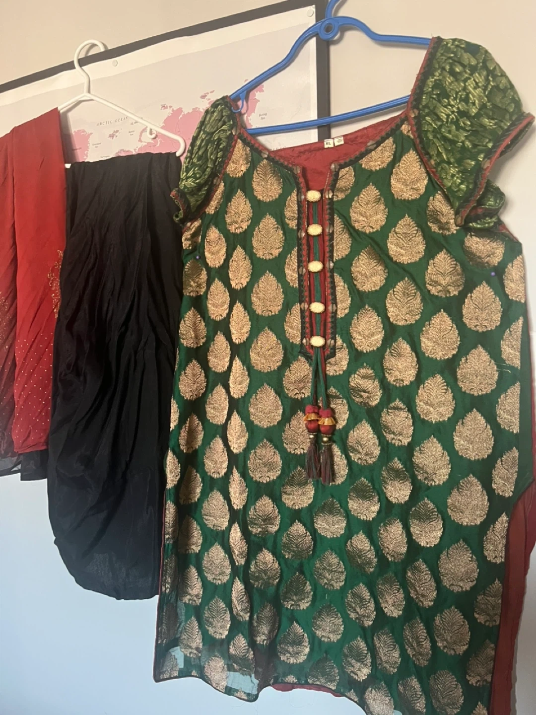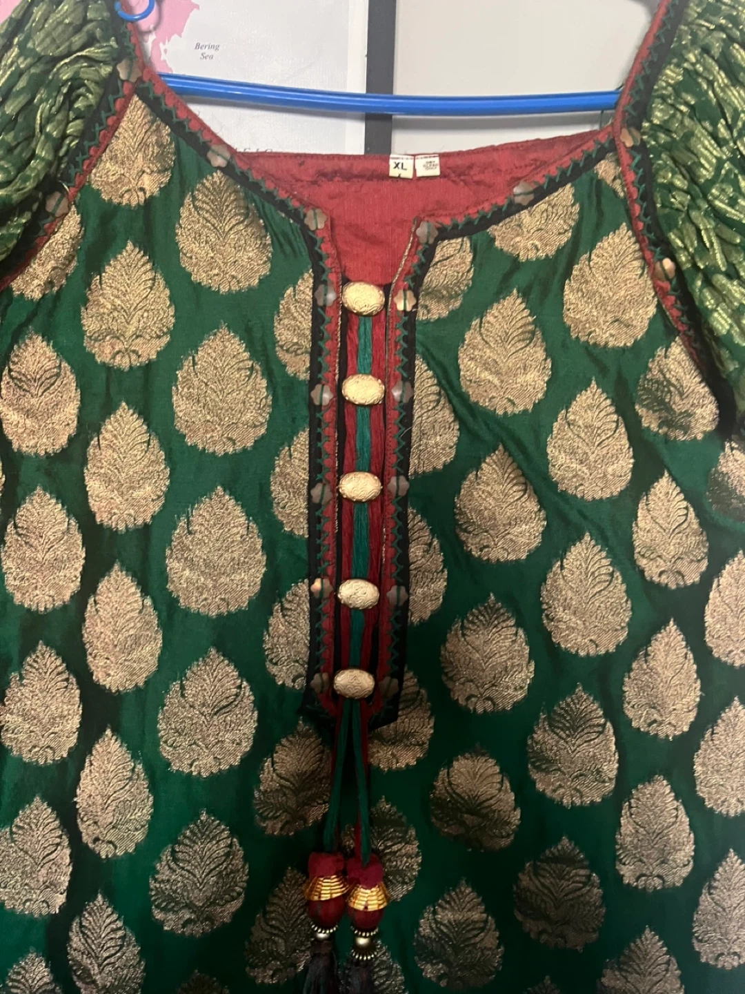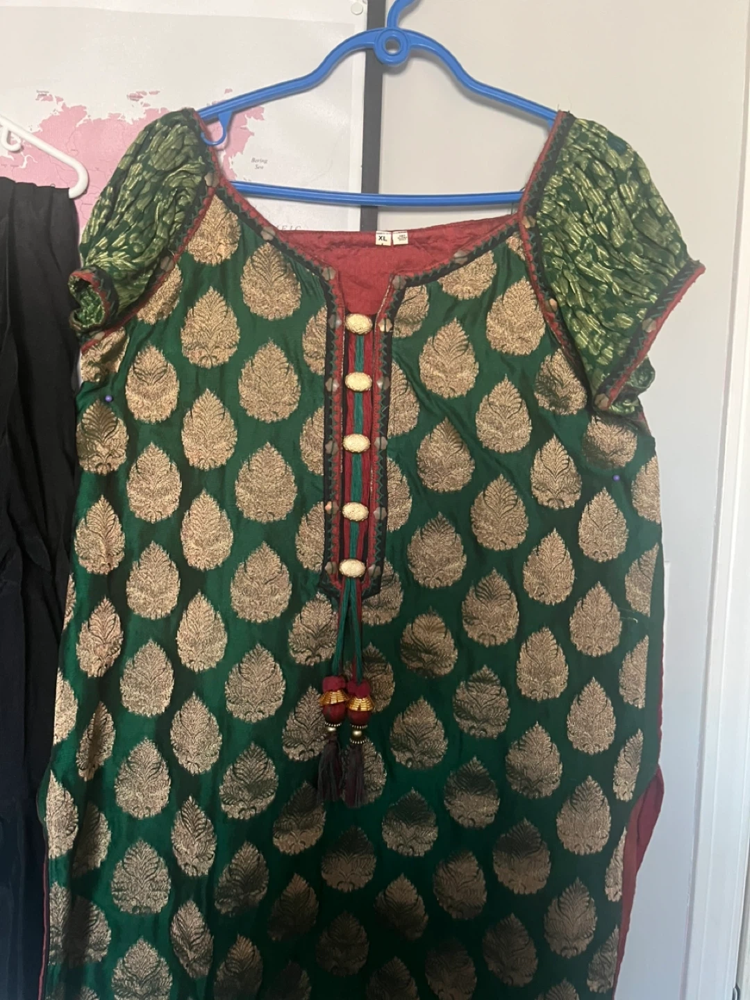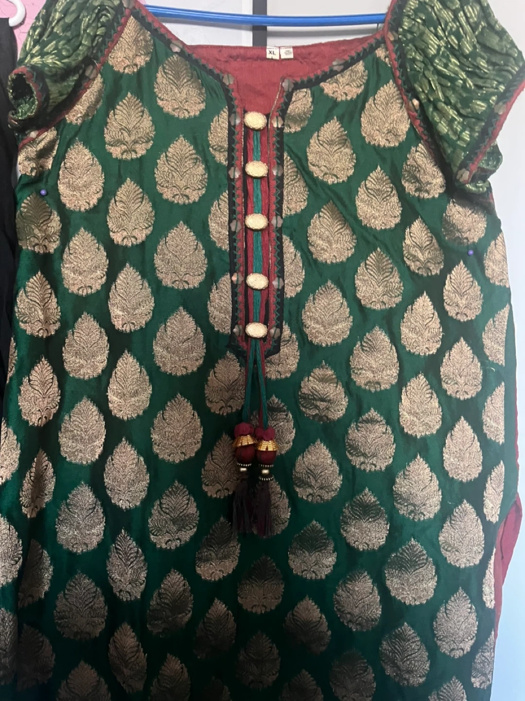 Kurta size XL, made with a green brocade fabric featuring a gold leaf pattern. It has decorative buttons and tassels on the neckline. Includes matching red dupatta and black bottoms.