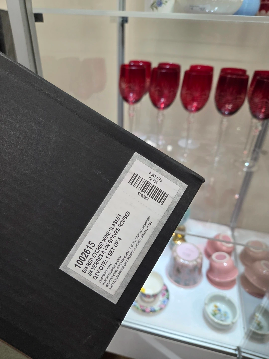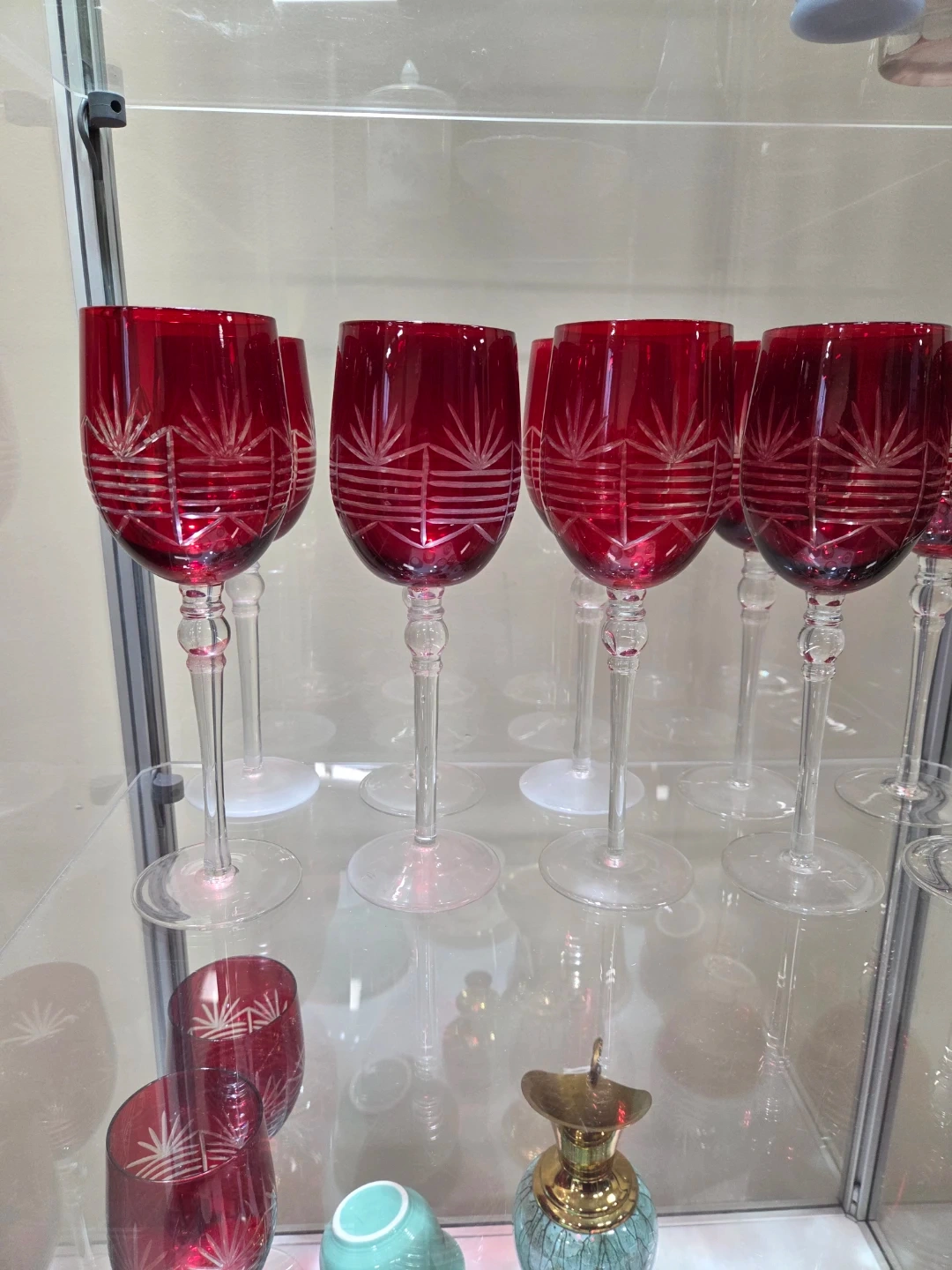 Beautiful red etched wine glasses, set of four. These glasses feature a delicate etched design on the bowl and a clear stem. Perfect for special occasions or elegant entertaining!