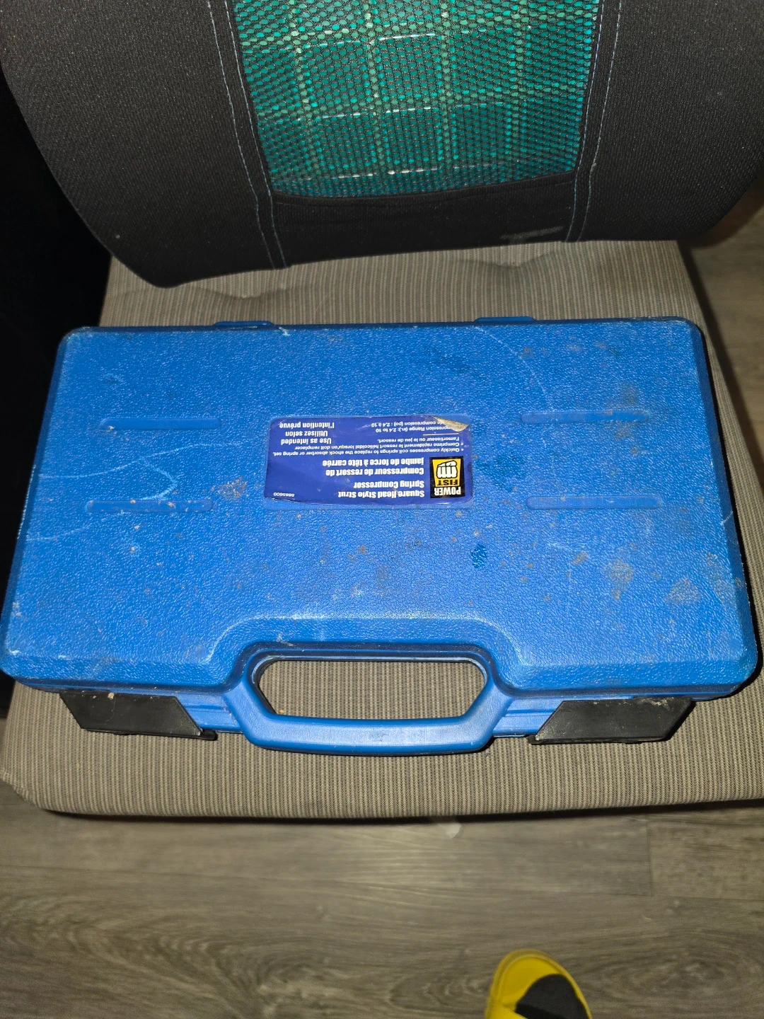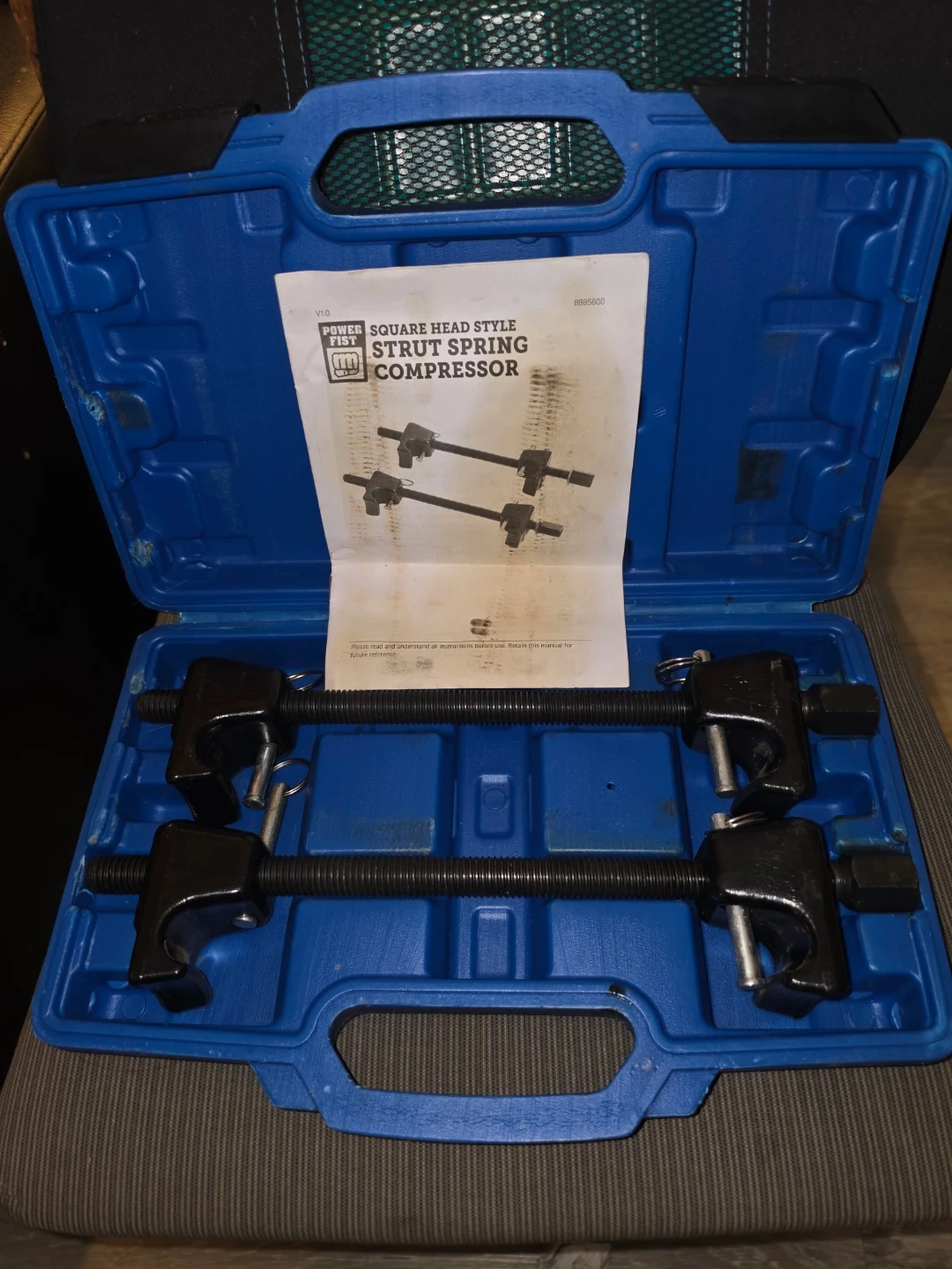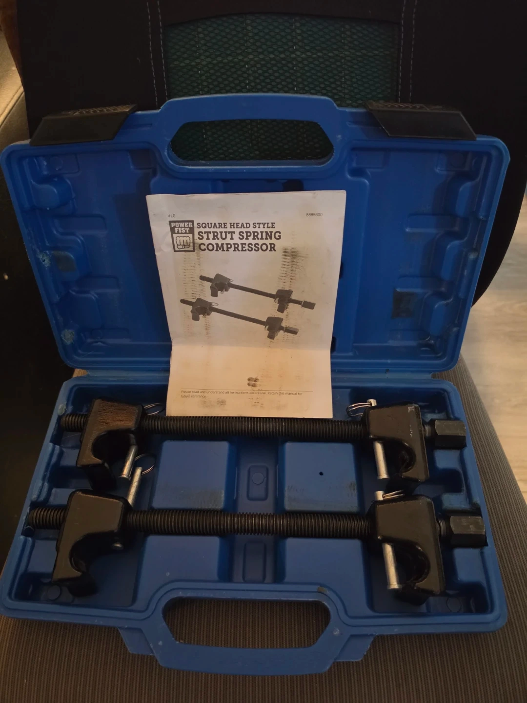 This Powerbuilt strut spring compressor kit is designed for square head style struts. It includes the necessary components to safely compress springs. This tool is handy for automotive suspension work.