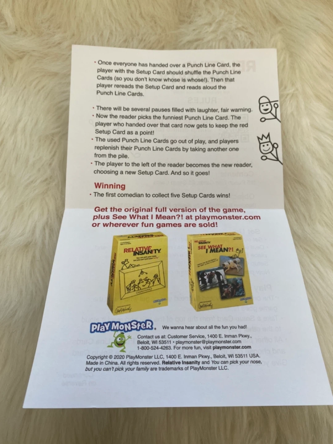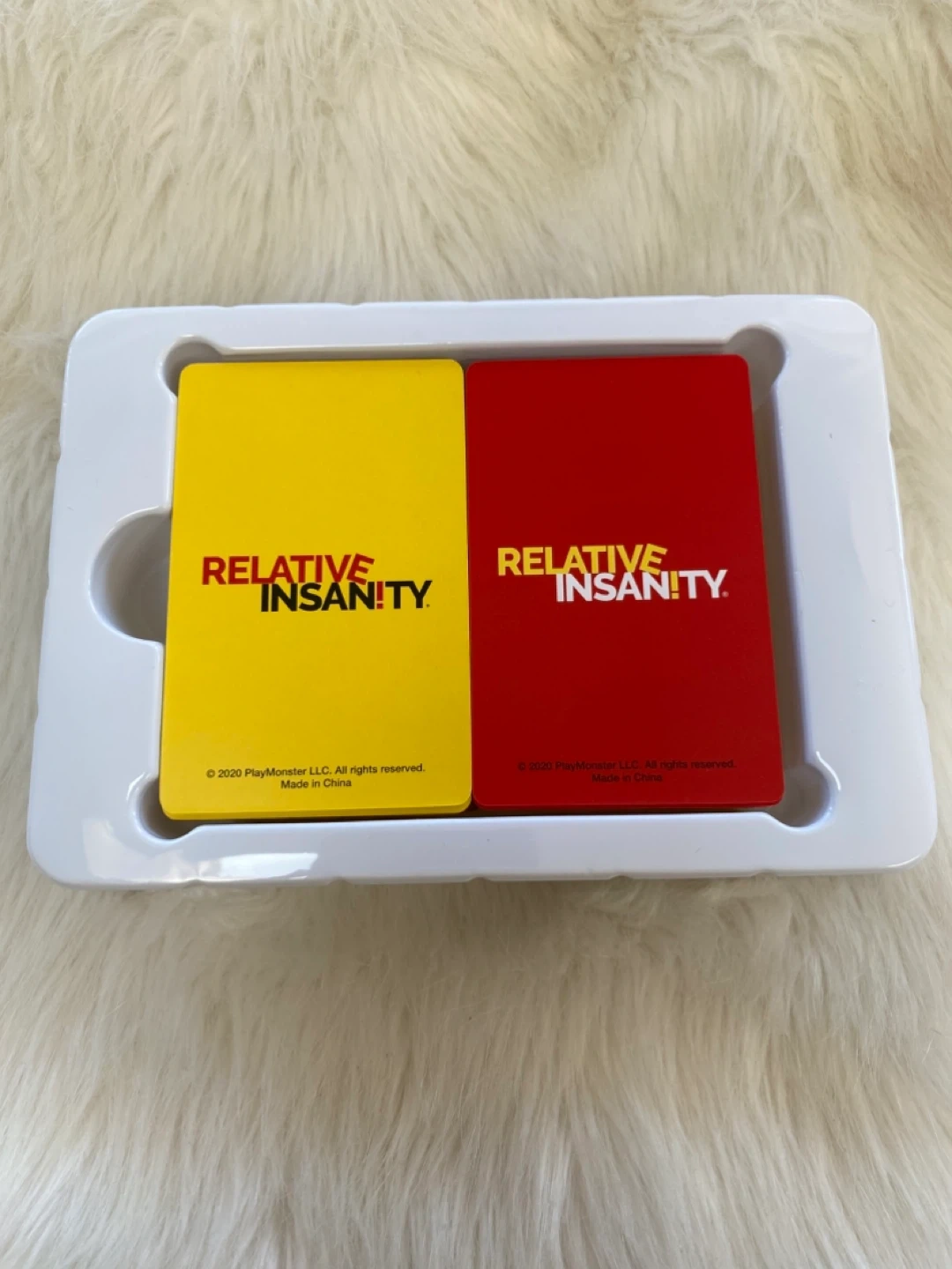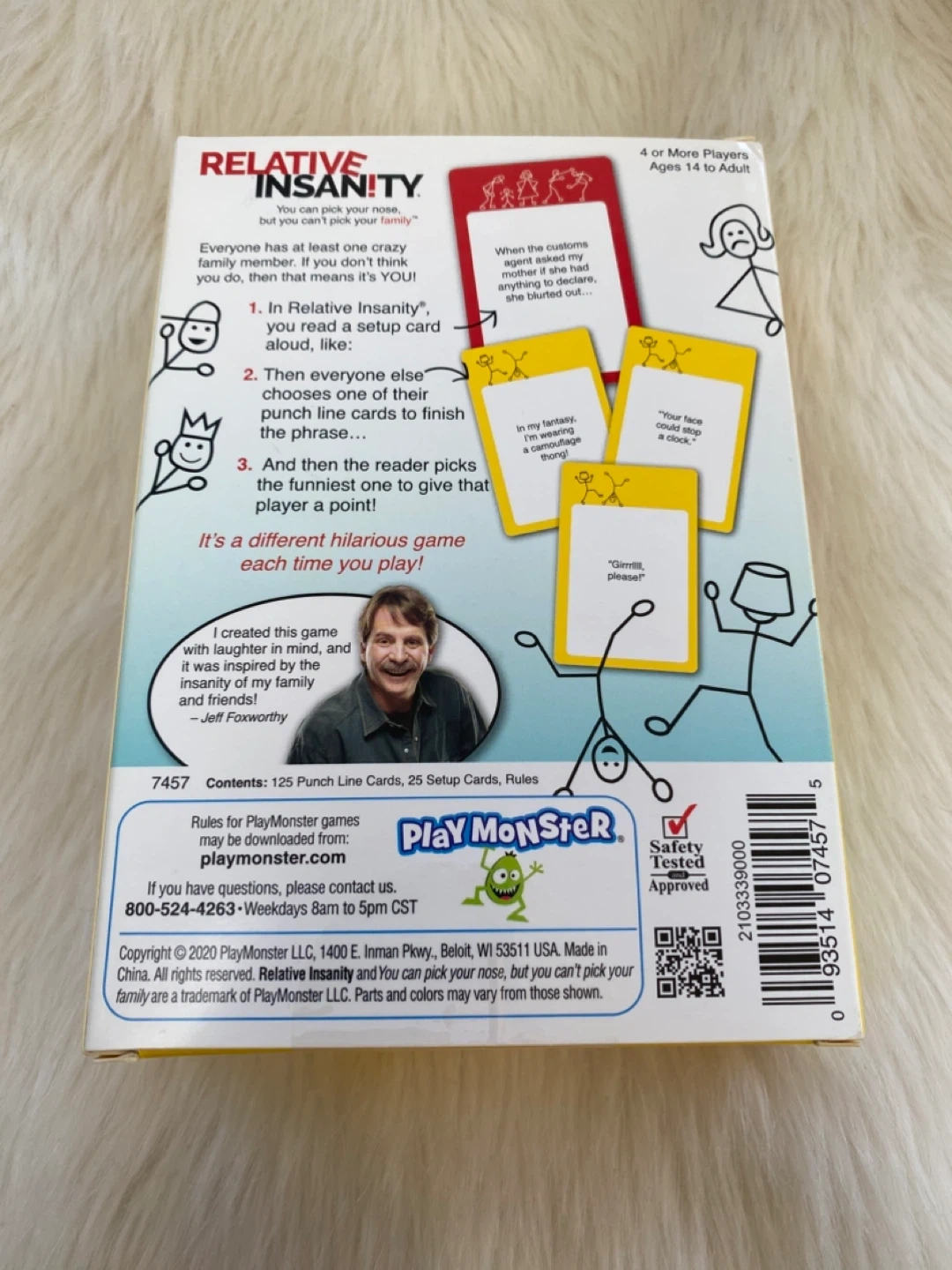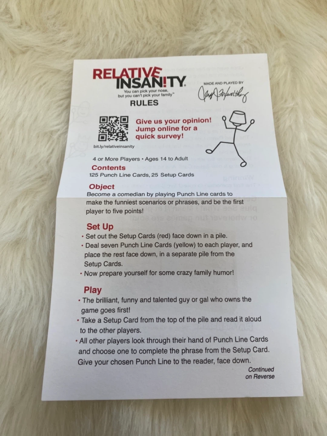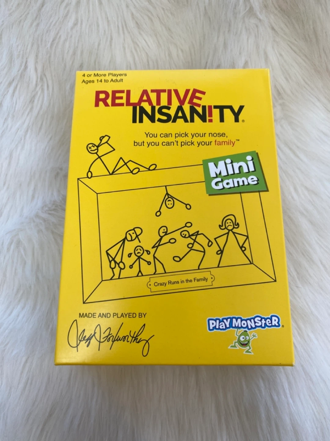Relative Insanity Mini Game for 4 or more players, ages 14 to adult. Comes with 125 Punch Line Cards and 25 Setup Cards. It's a hilarious game that's fun for the whole family!