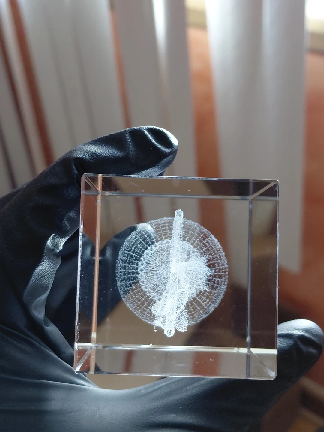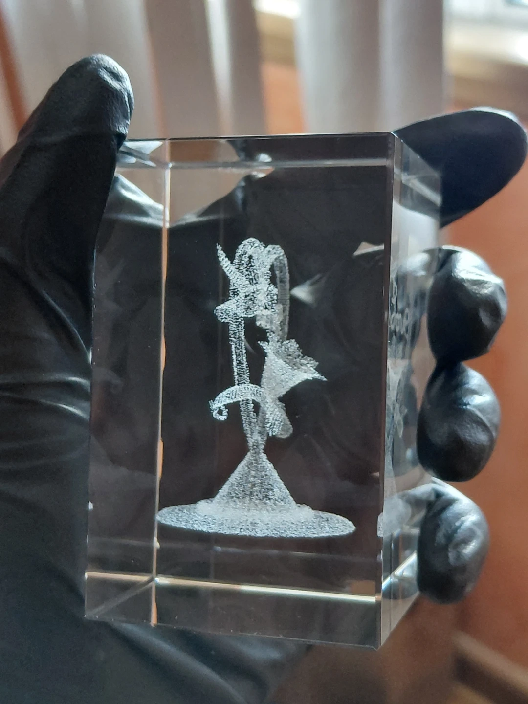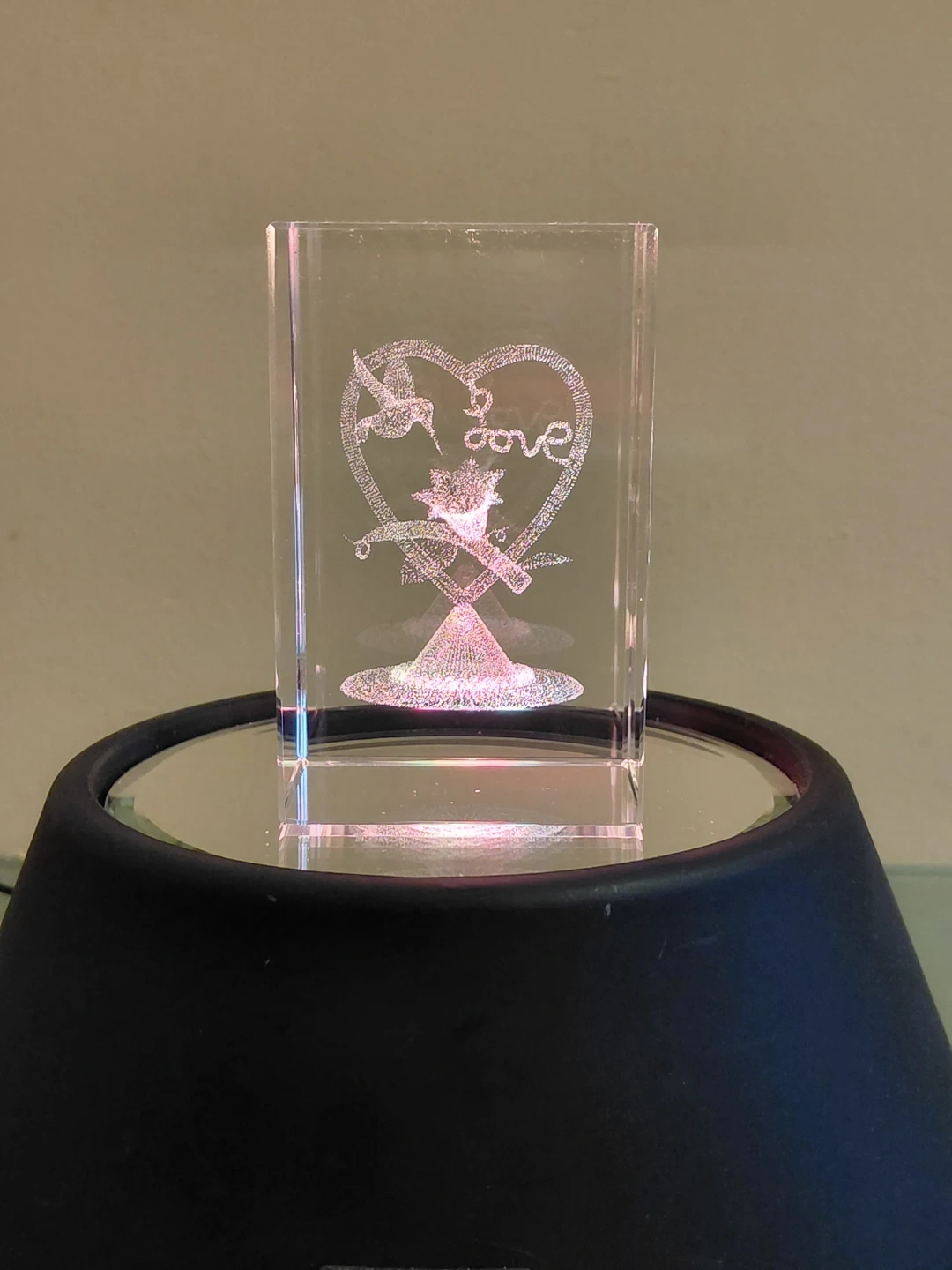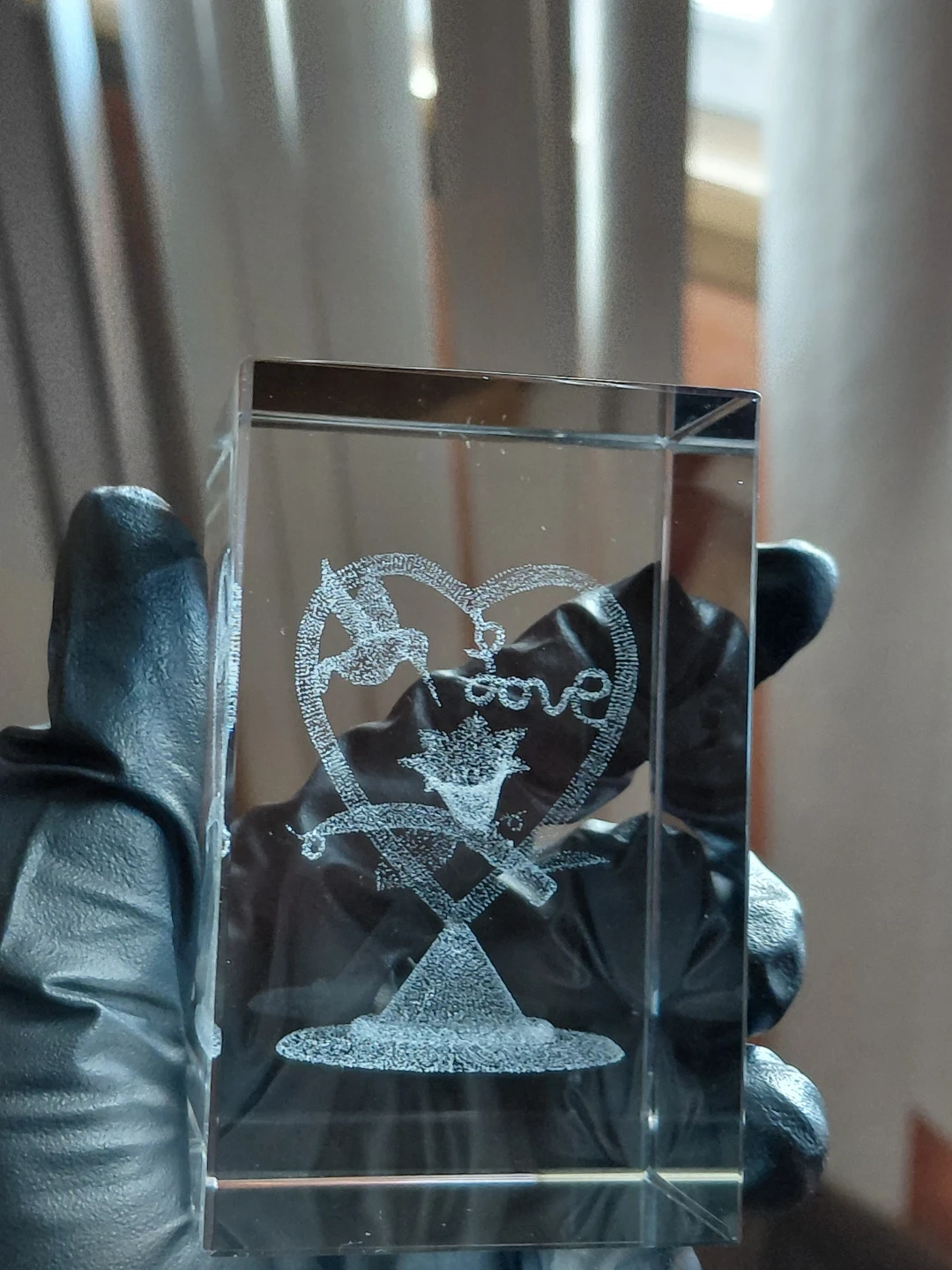 This is a beautiful crystal engraving featuring a heart with the word 'love' inside, adorned by a dove and a floral motif. It's made of clear glass and has a lovely etched design. It would make a sweet decorative piece for any shelf or tabletop.