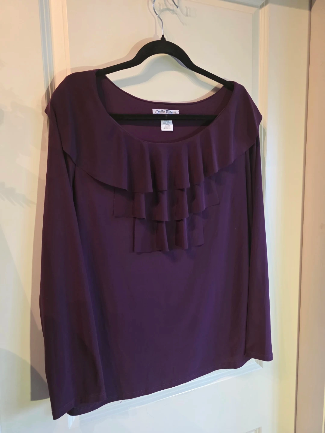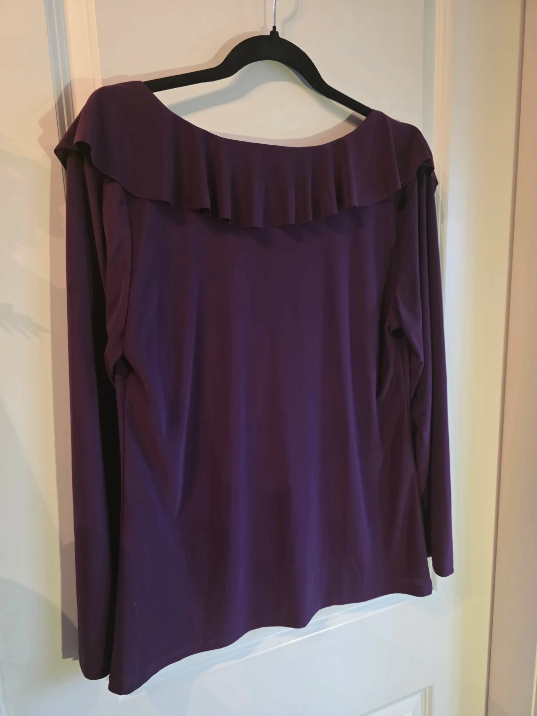 This is a 3/4 length sleeve deep purple top by Claudia Richard. It has a decorative ruffled neckline. Made of a blend of polyester and spandex. Size is large.