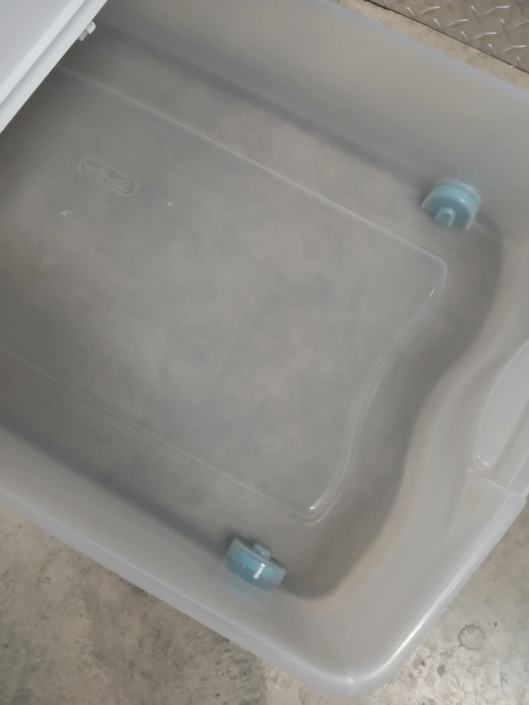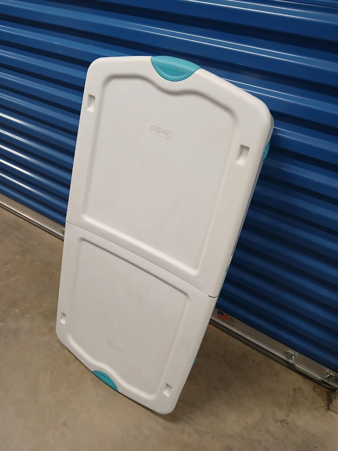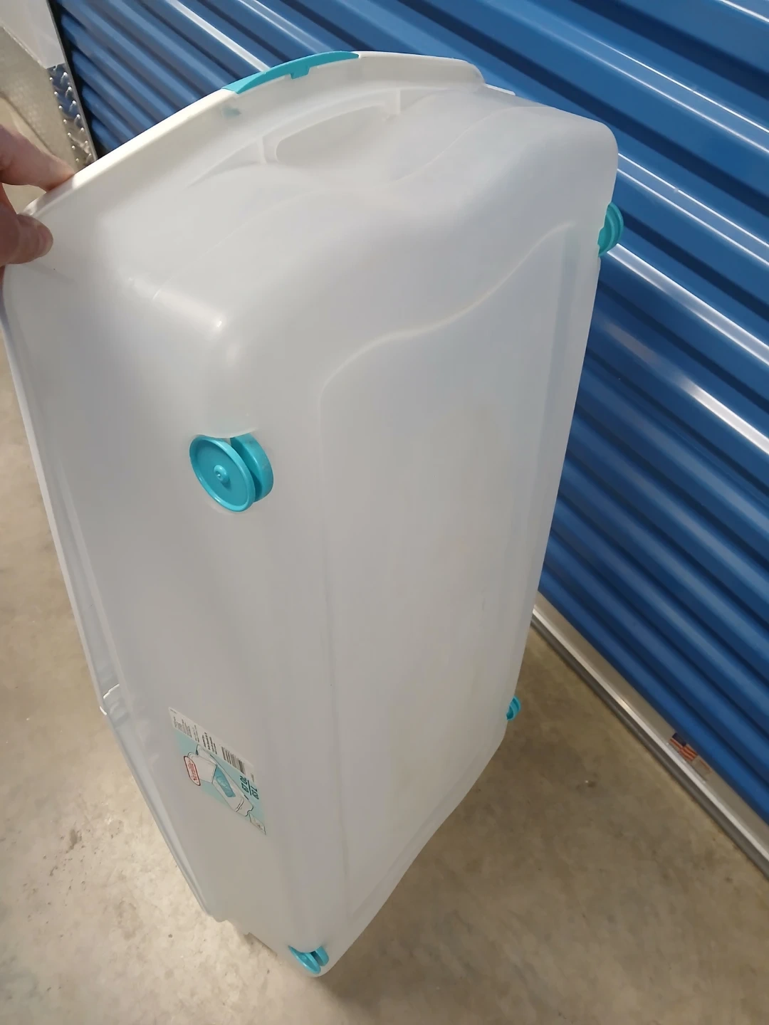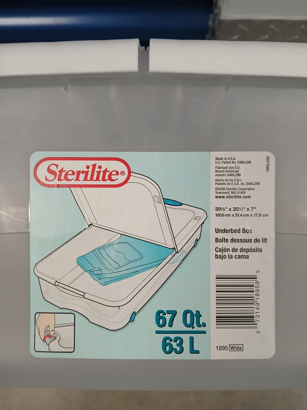 Sterilite underbed storage box. 67 Qt / 63 L capacity. Dimensions are 39 1/4" L x 20 1/4" W x 7" H. Clear plastic with white lid and teal accents. Wheels for easy rolling. Perfect for storing items under a bed!