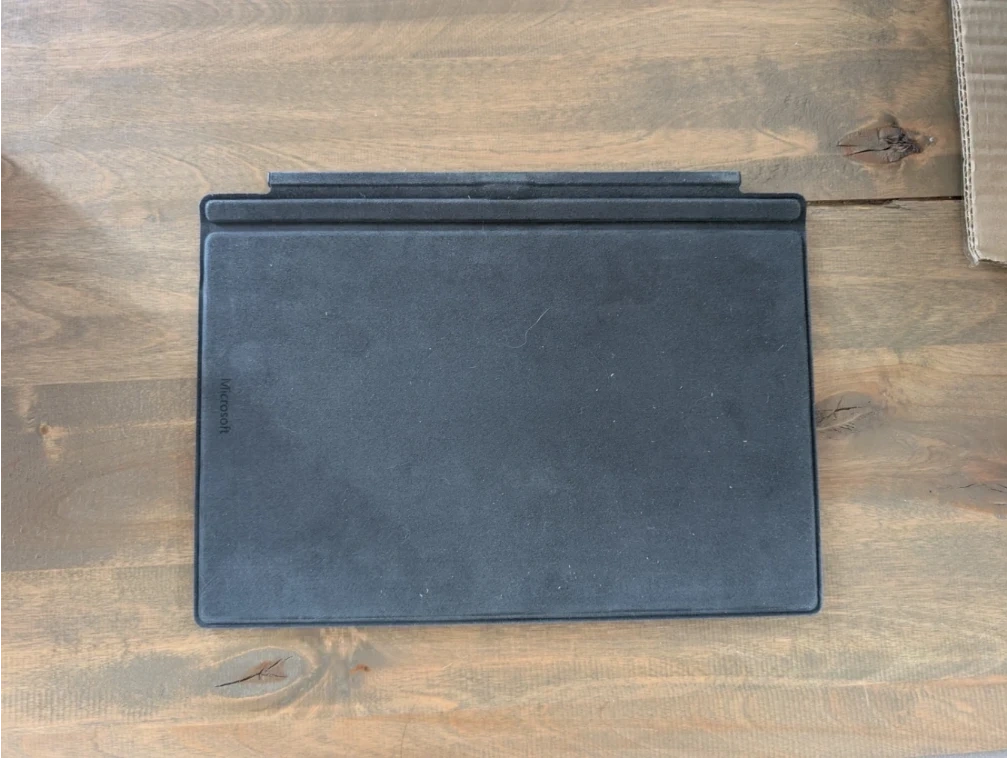 A black Microsoft Surface Pro Signature Type Cover. It's made from Alcantara material. This cover attaches magnetically to your Surface Pro.