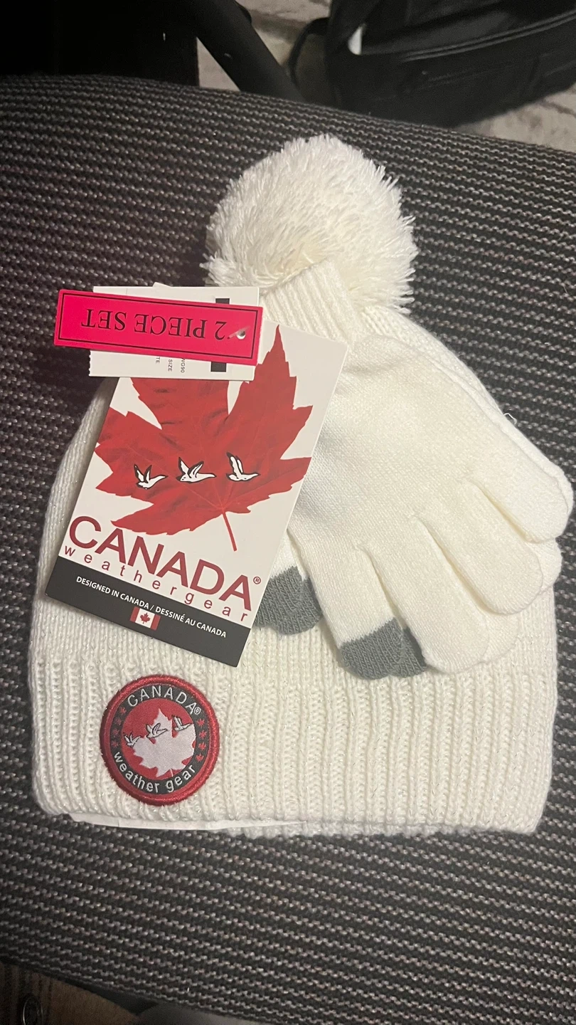 Stay warm with this Canada Weathergear 2-piece set. It includes a cozy knit hat and matching gloves. Designed in Canada.