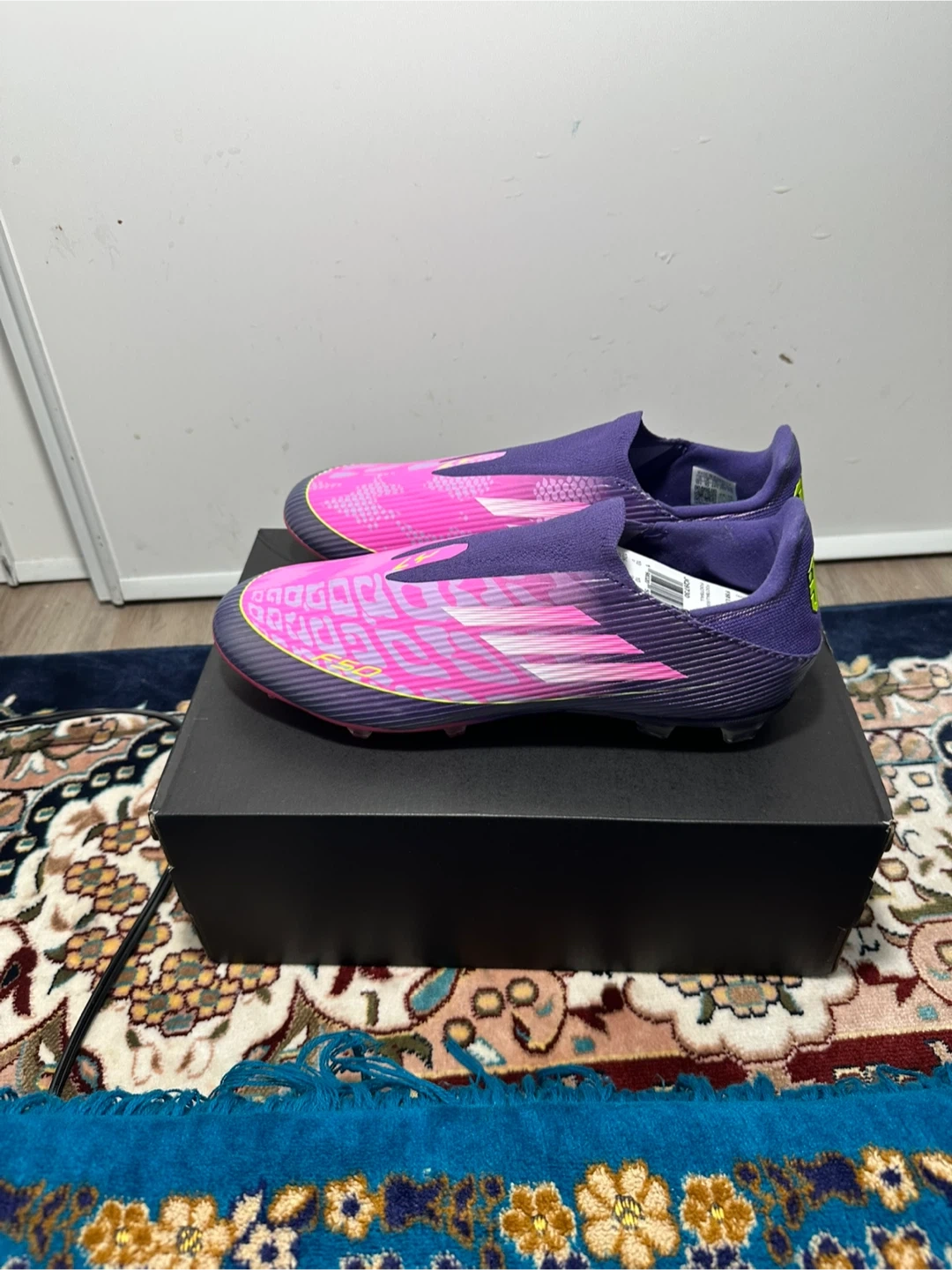 Adidas X Speedflow.1 football cleats in a size 10. These are laceless with a vibrant pink and purple gradient design. They're built for speed and agility on the pitch!