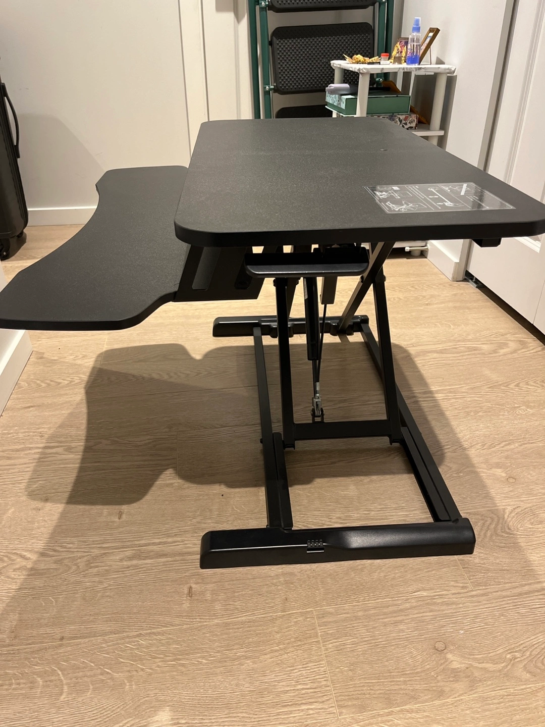 Black standing desk converter. Features a height-adjustable design and a keyboard tray. Great for improving posture and ergonomics.