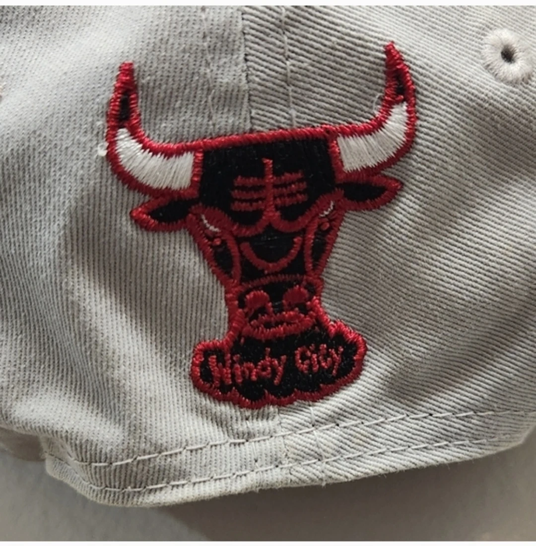 This is a Vintage New Era 9FIFTY snapback hat featuring the Chicago Bulls logo. It's gray with a red brim and includes 'Windy City' embroidery. This cap is adjustable for a comfortable fit.