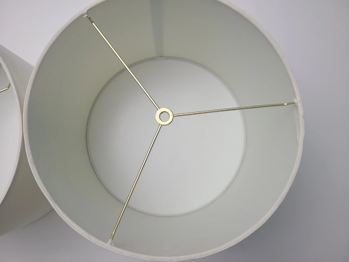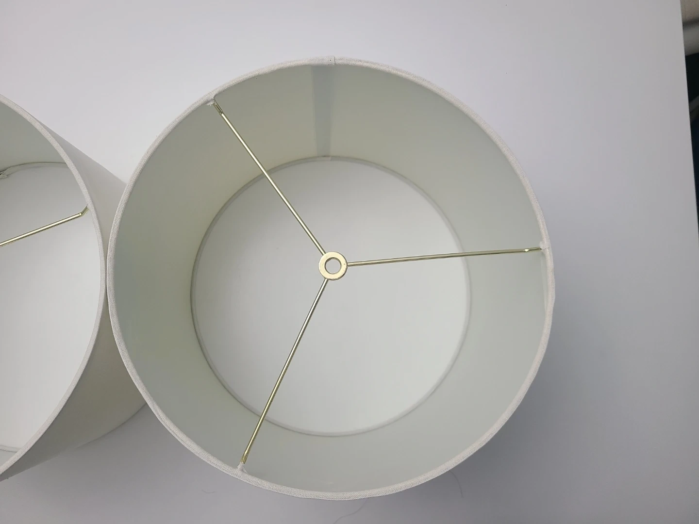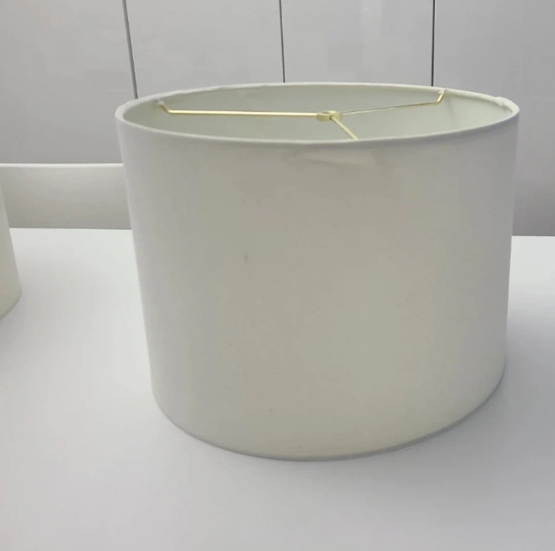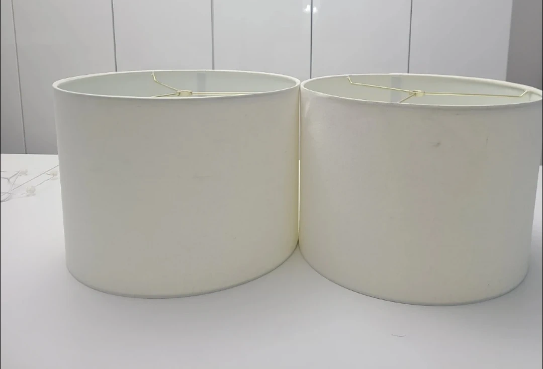 Selling a pair of cream-coloured lampshades. They're a classic drum shape with a simple fabric finish. These shades are ready to update your lamps!