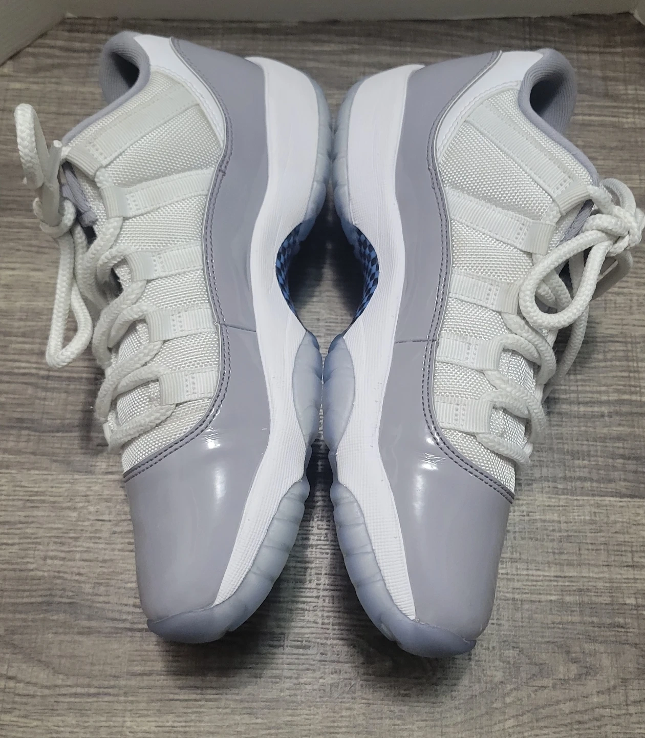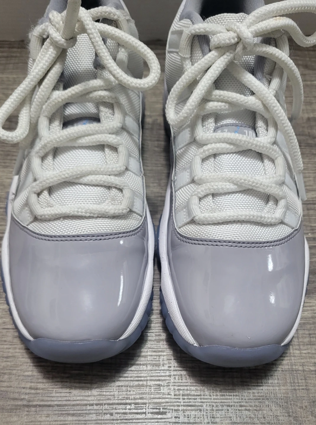 Jordan 11 Retro Low TD sneakers in the "Cement Grey" colorway. Youth size 7Y. These kicks feature a white mesh upper with grey patent leather overlays and translucent icy soles.