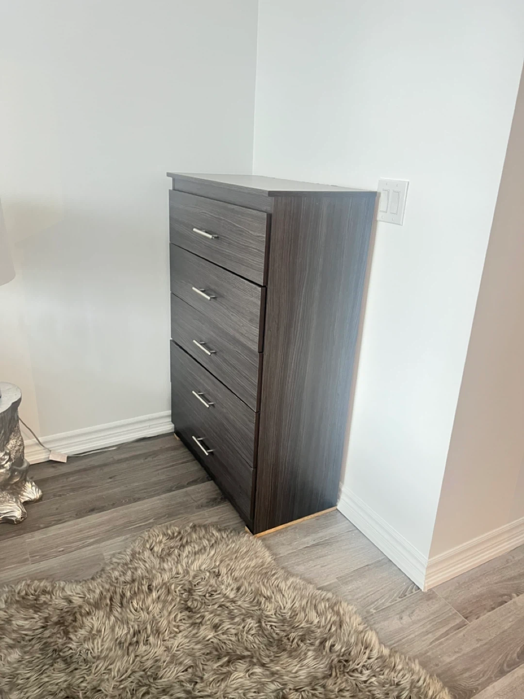 This dresser has a dark grey wood-look finish and five drawers for storage. It's great for organizing clothing or linens. The sleek design fits well in most bedrooms.