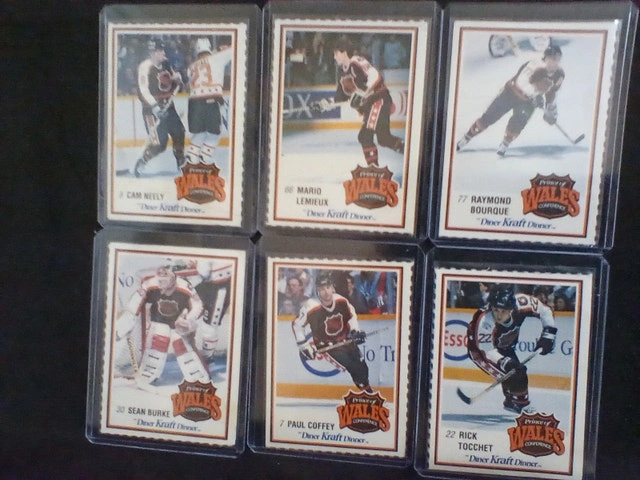 1989/1990 Prince Of Wales Kraft Dinner Hockey Cards set. Includes #52 Ray Bourque, #53 Sean Burke, #54 Paul Coffey, #55 Mario Lemieux, #56 Cam Neely, and #57 Rick Tocchet. All cards are in very good condition and well preserved. Please see pictures for details.