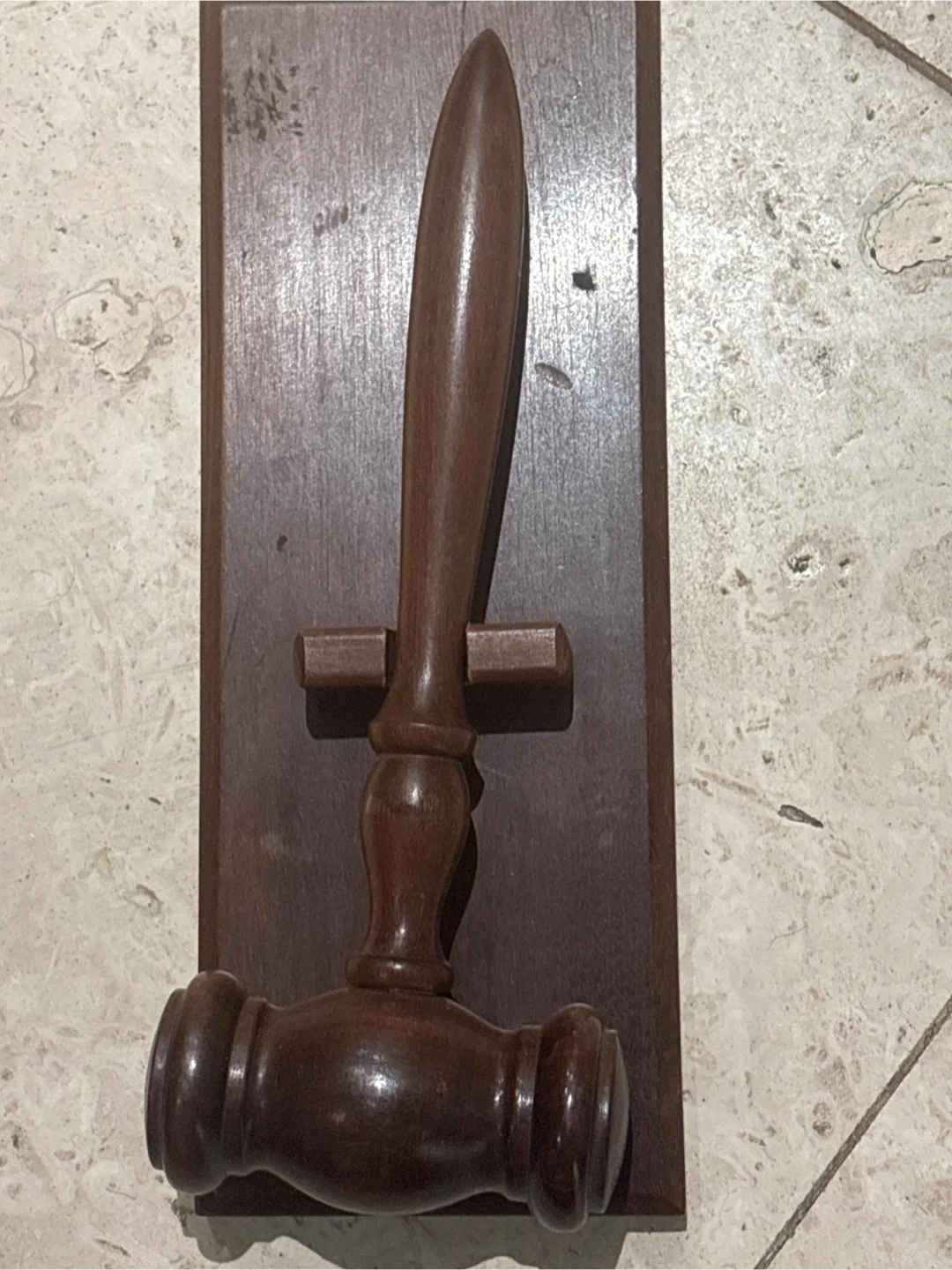 ๐ This is a decorative wooden gavel mounted on a wooden plaque. It's crafted from dark wood with a polished finish. It makes a nice display piece! The gavel is removable and was a gift to me when I left the courts