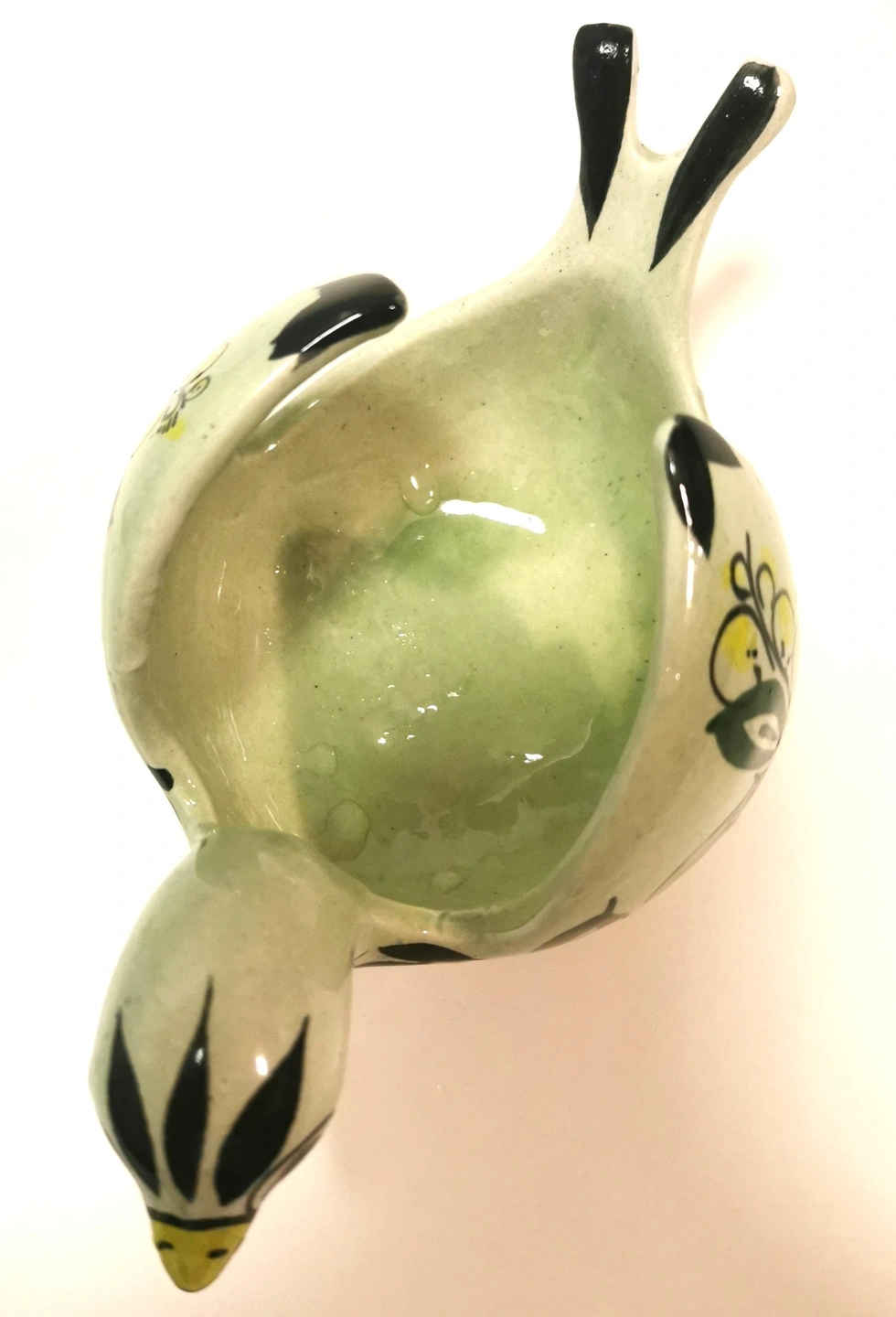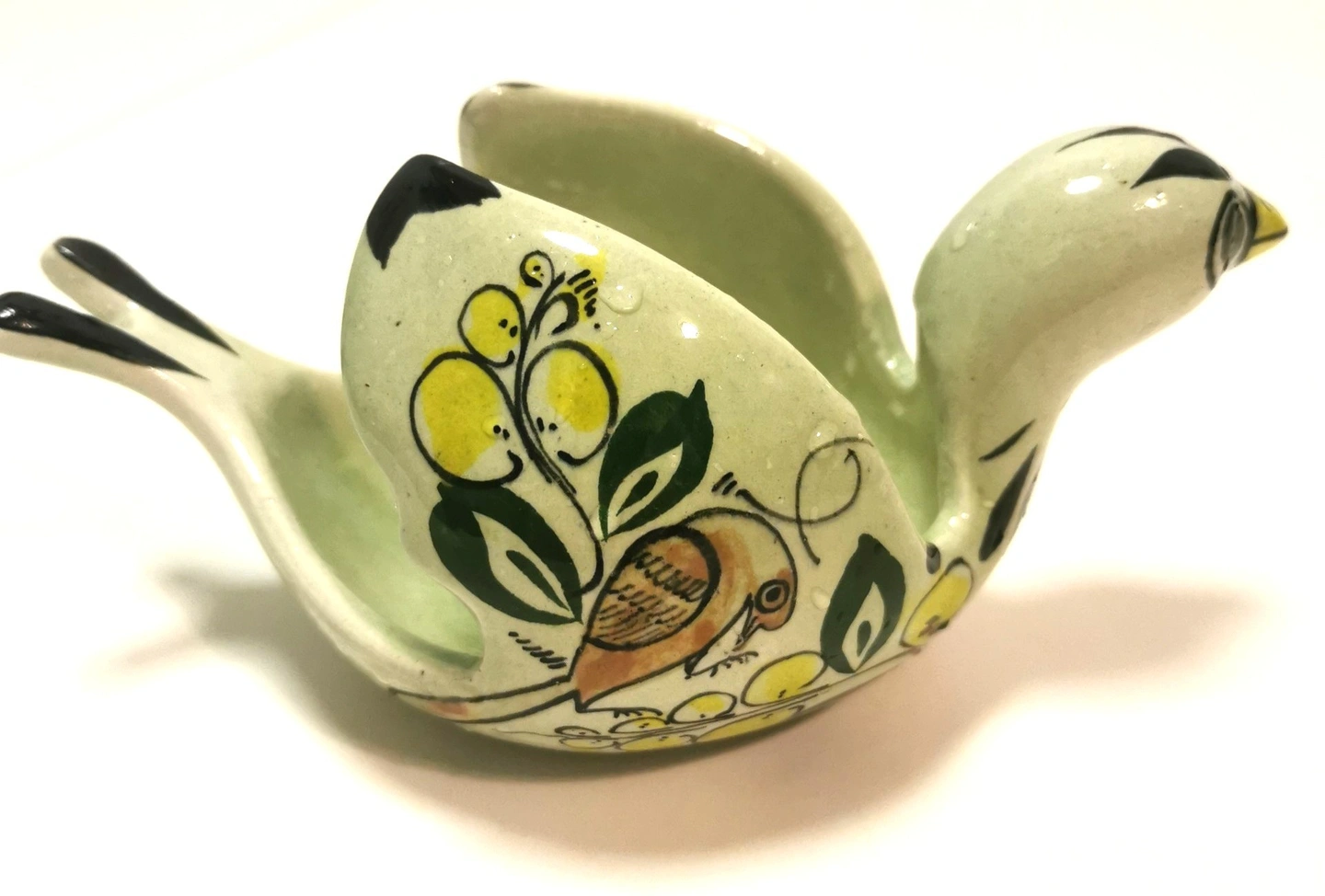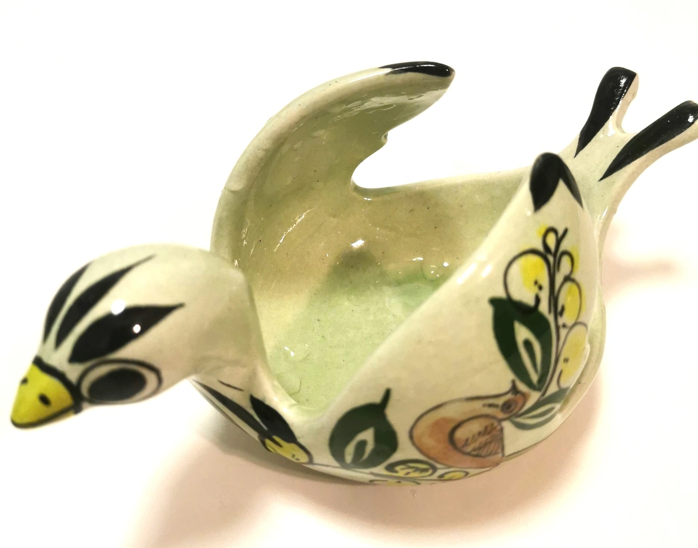 Condition: Good vintage condition light wear. The hand-painted glaze is vibrant and well-preserved. Minor surface wear on the unglazed base is consistent with its age. Please review photos as they are part of the description of the item.