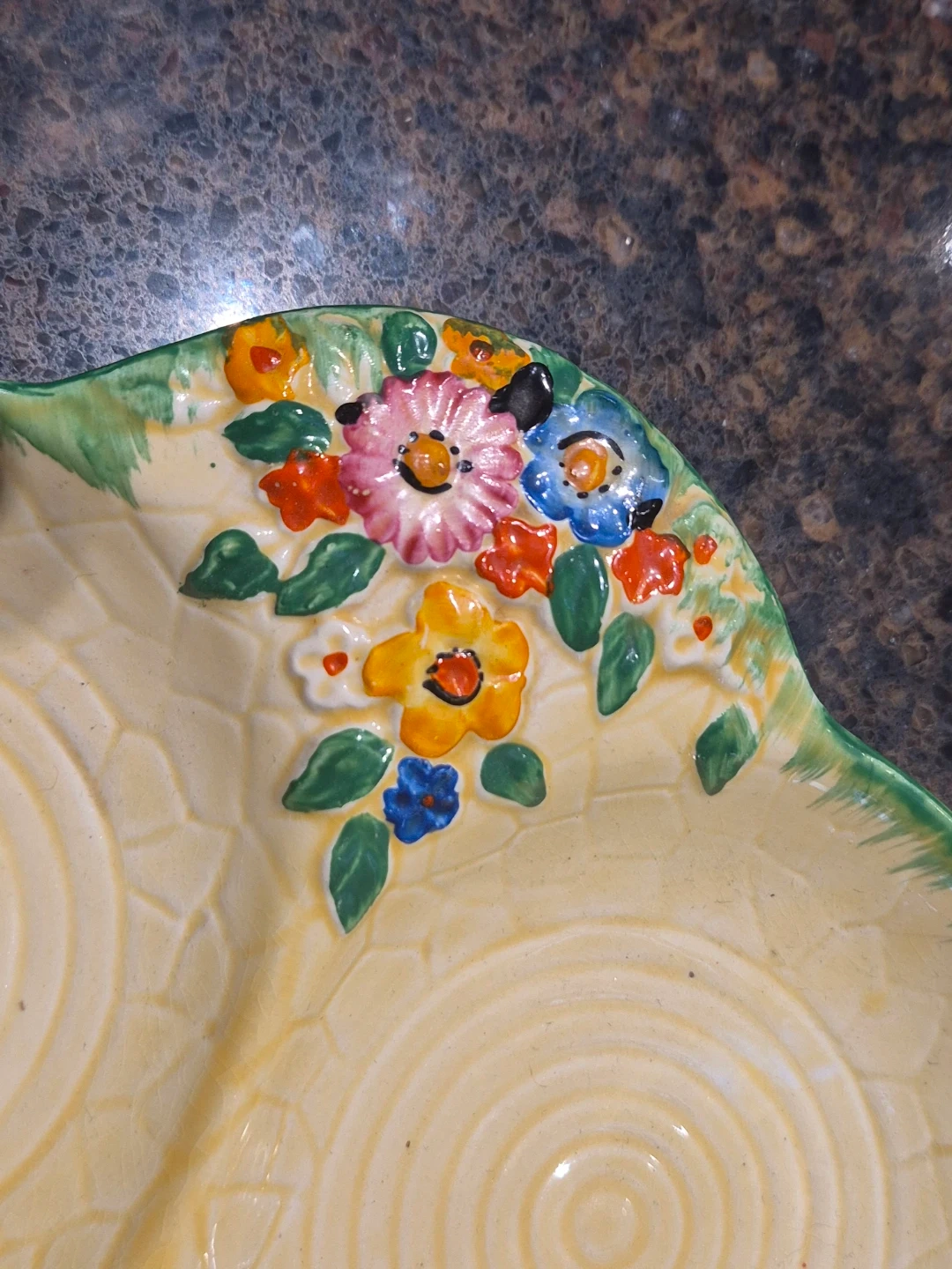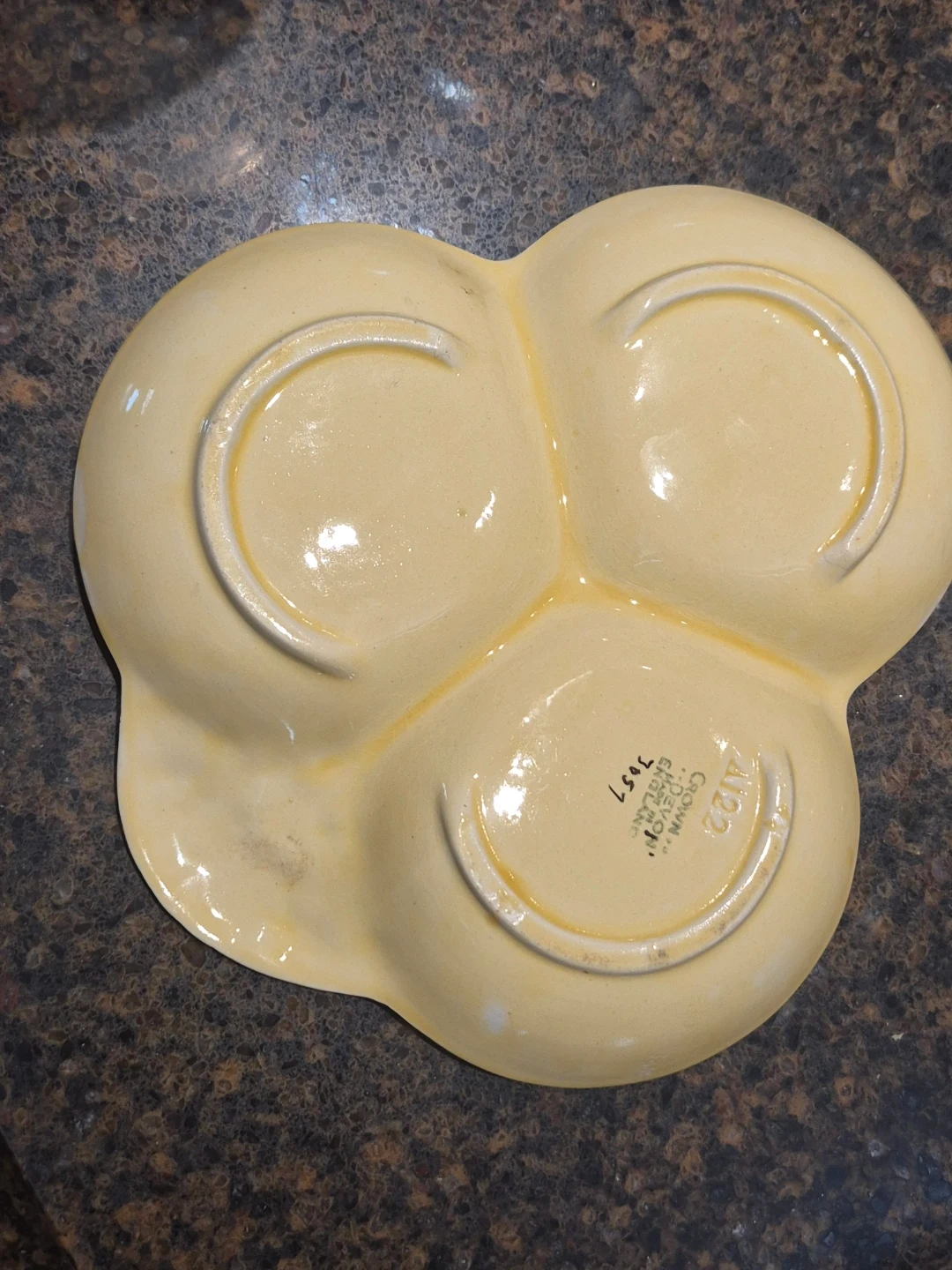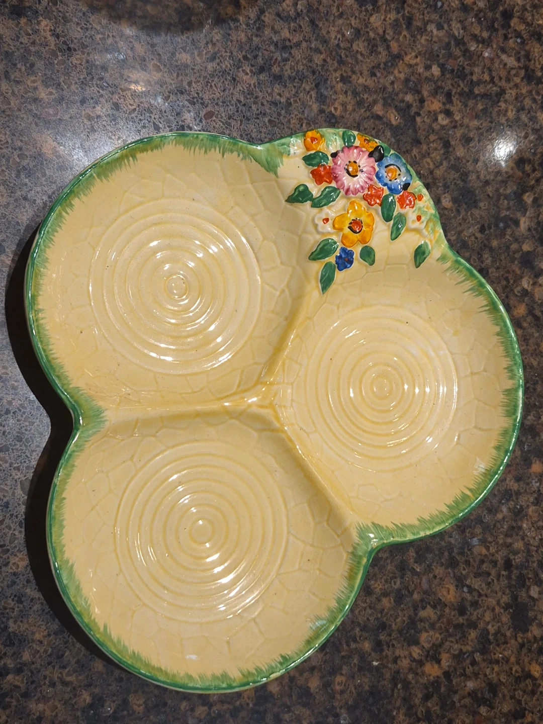 Pretty divided dish from Crown Devon. Features a cheerful floral design with green trim. Perfect for serving relishes or small appetizers! Very minor flaw on edge, see pic. Measures approx 7 inches in diameter