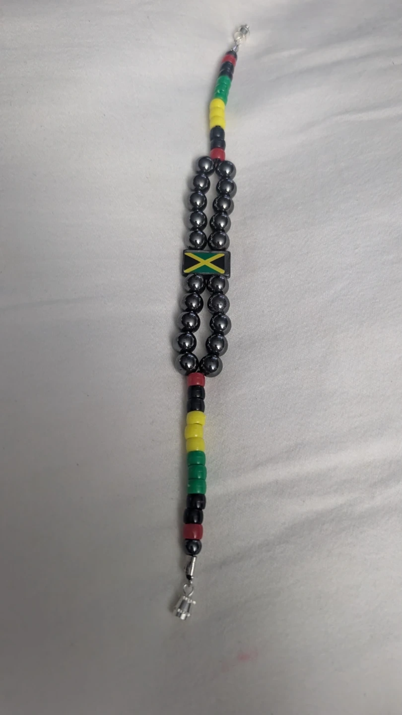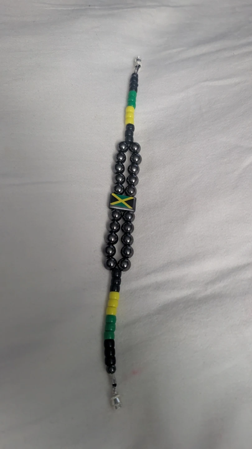 This double-strand beaded bracelet features black, green, and yellow beads, representing the Jamaican flag. It also has a small charm displaying the Jamaican flag. The closure is a silver-tone clasp.
