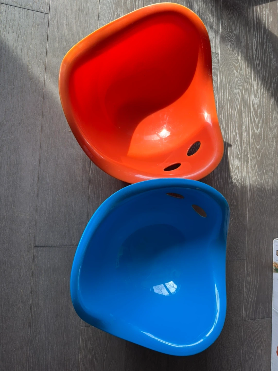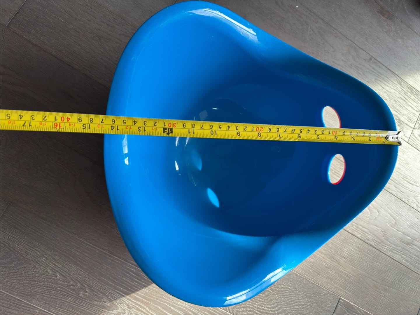 This is a blue plastic wobble seat, sometimes called a scoop chair. It measures about 15 inches in length and 12 inches in height. It's made of durable plastic and has two holes for stability or carrying. Great for sensory play or quiet time!
