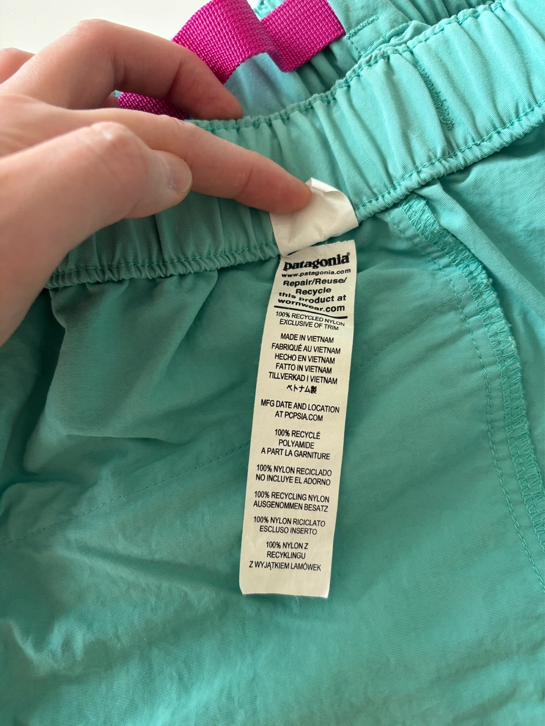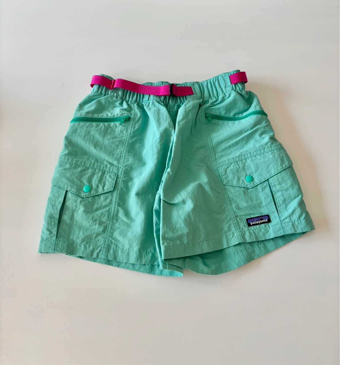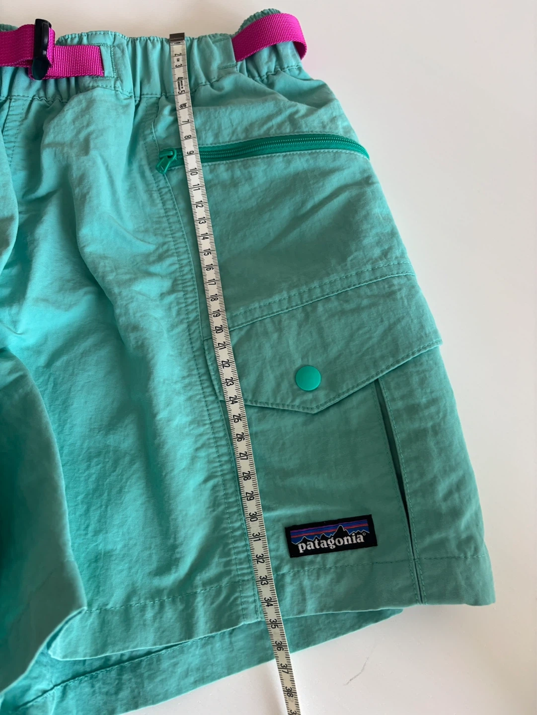 These are Patagonia shorts in a bright aqua colour. They feature an elastic waistband with an adjustable pink belt and multiple cargo pockets with zippers. Made from 100% recycled nylon.