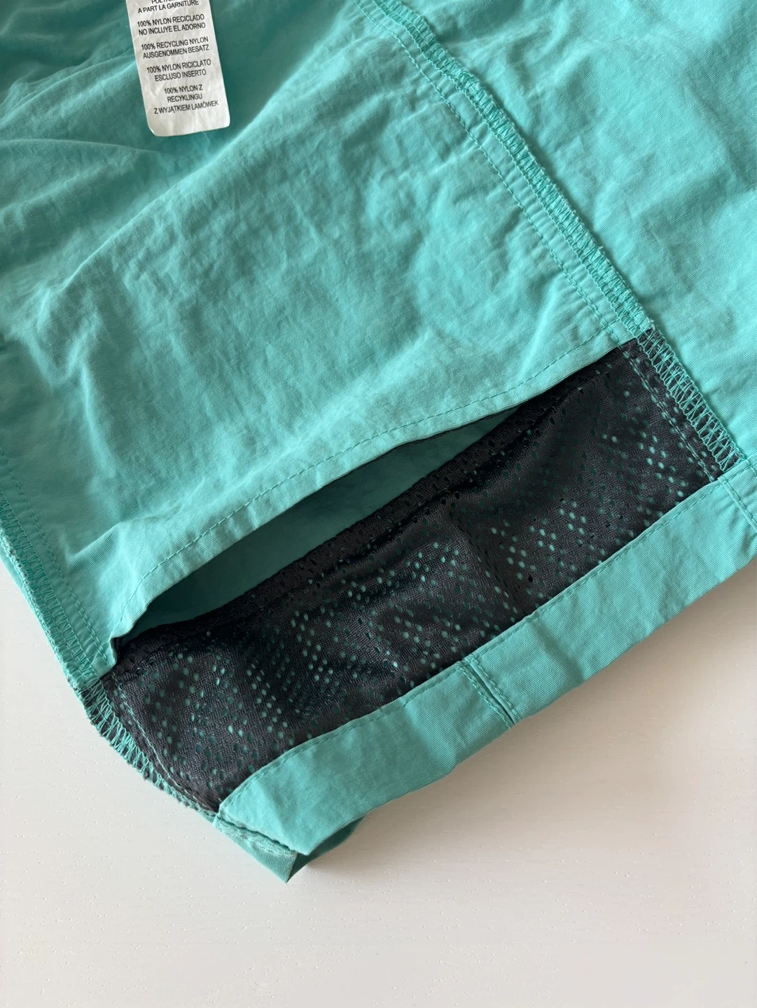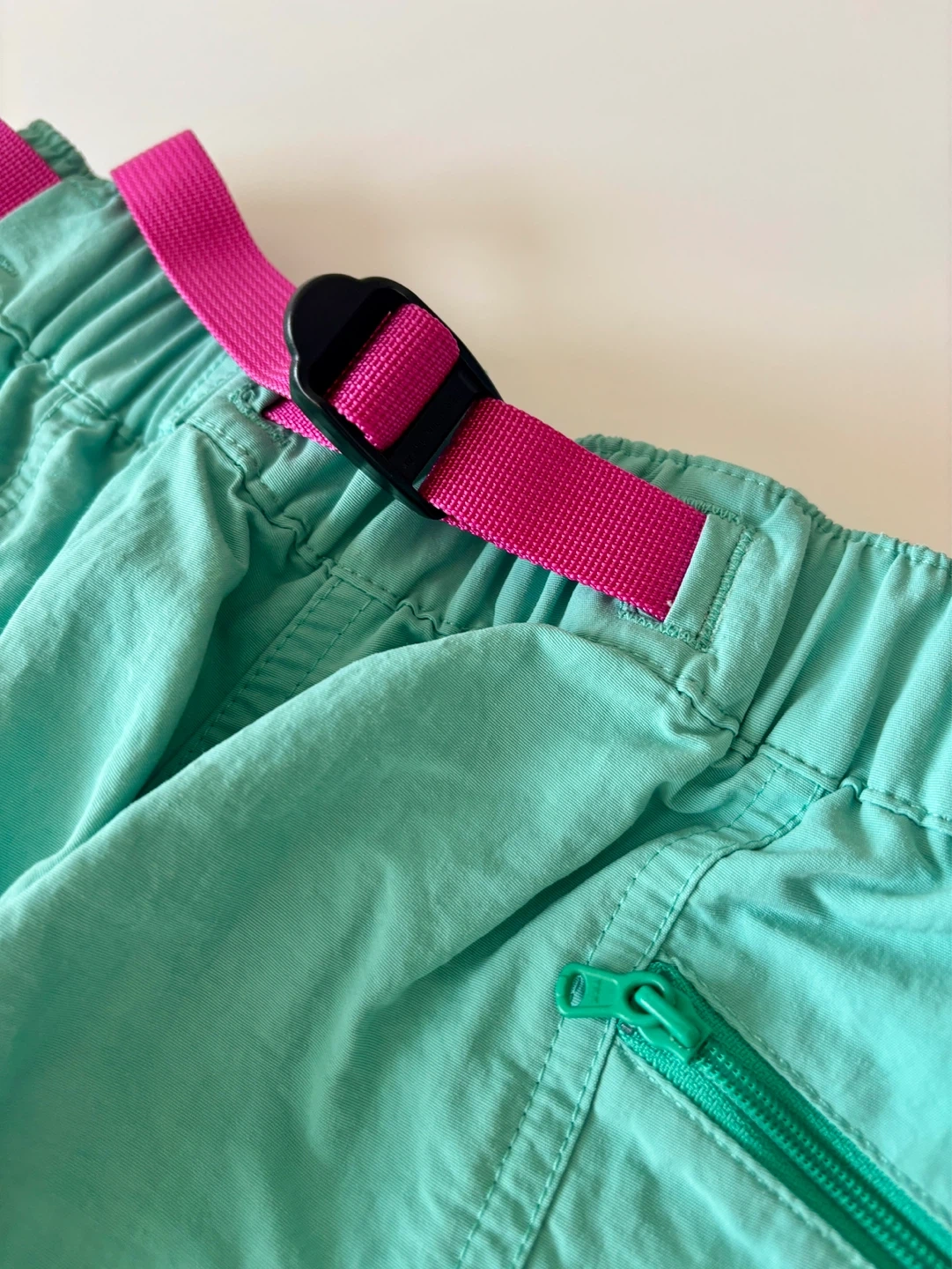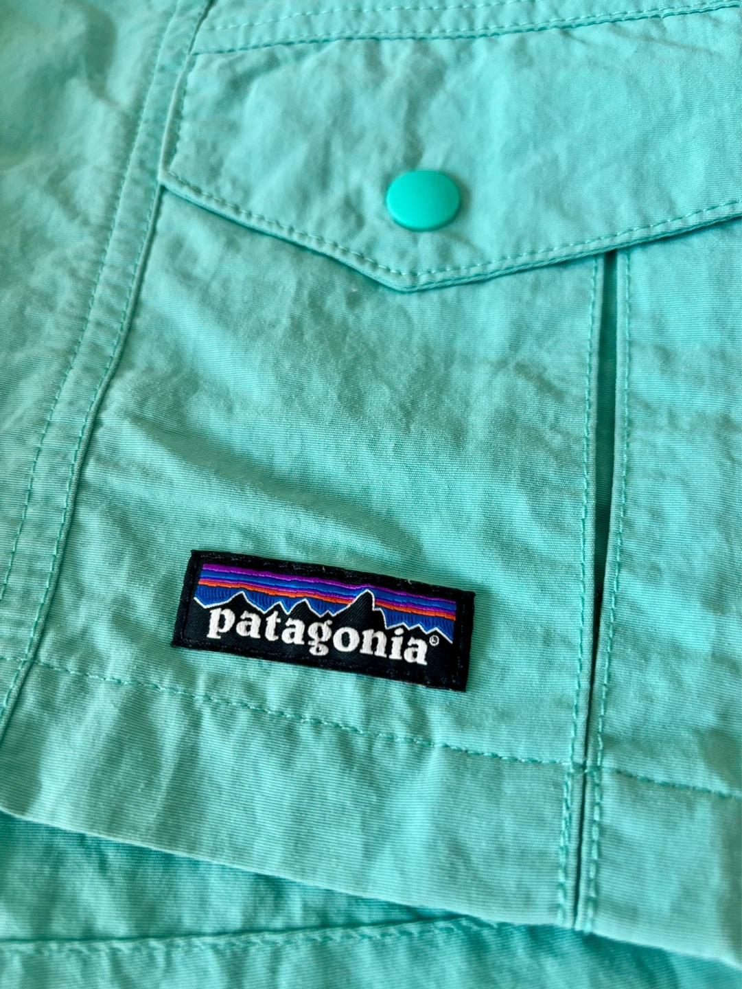 These are Patagonia shorts in a bright aqua colour. They feature an elastic waistband with an adjustable pink belt and multiple cargo pockets with zippers. Made from 100% recycled nylon.