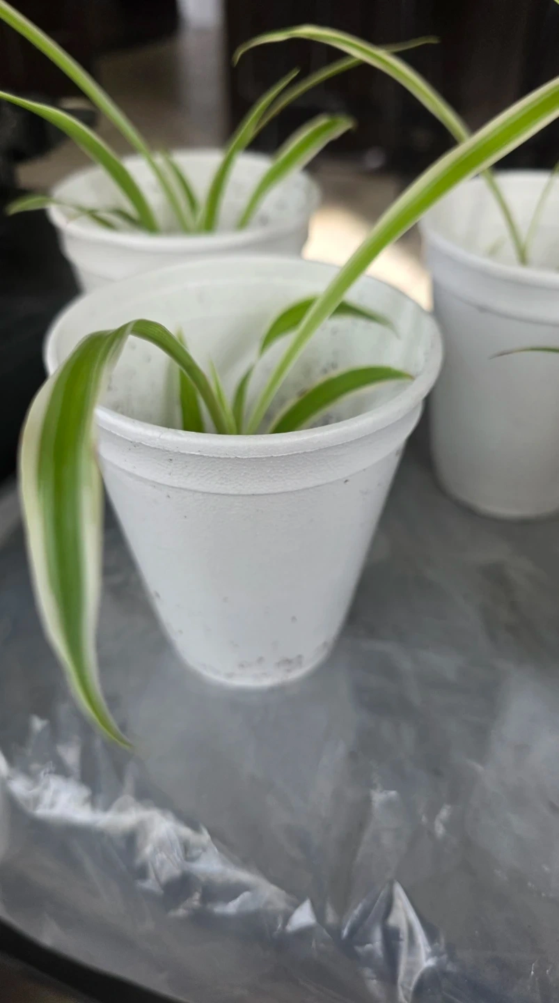 Healthy spider plant cuttings ready for new homes. These are green and white variegated spider plants, known for purifying indoor air. They're easy to care for and grow quickly! A great starter plant for anyone.