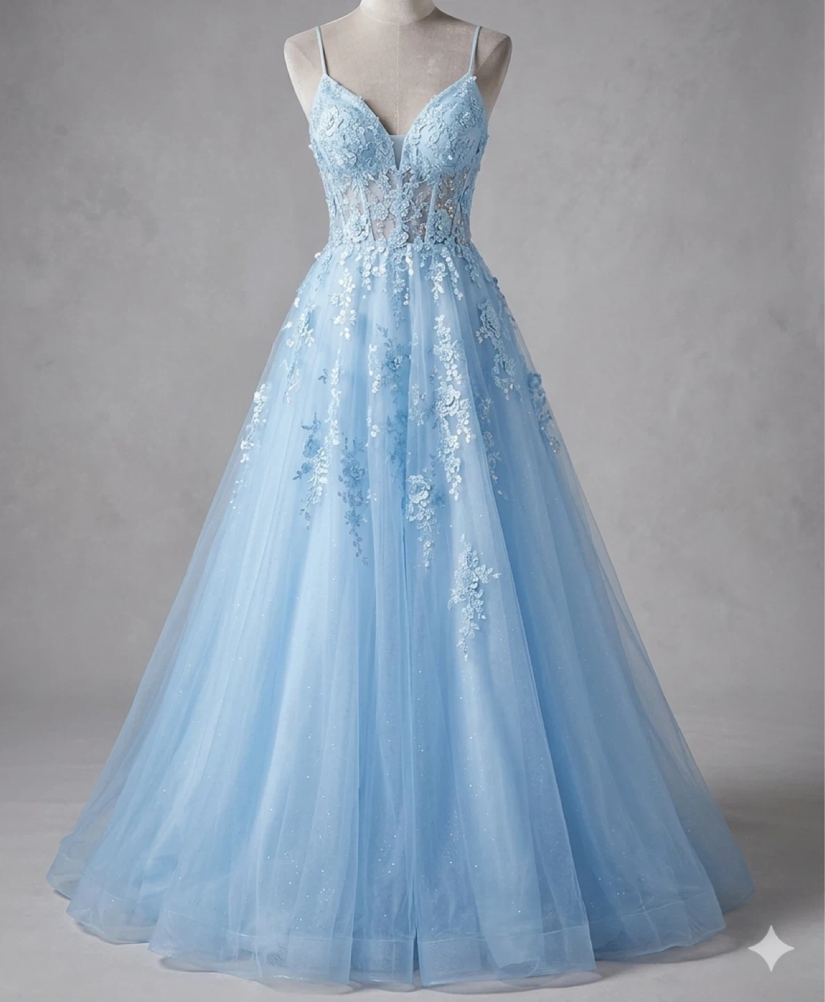 This stunning light blue ball gown features delicate lace appliques and sparkling sequins scattered across a flowing tulle skirt. It has a fitted bodice with spaghetti straps and a sweetheart neckline. It's perfect for proms, weddings, or any formal event!