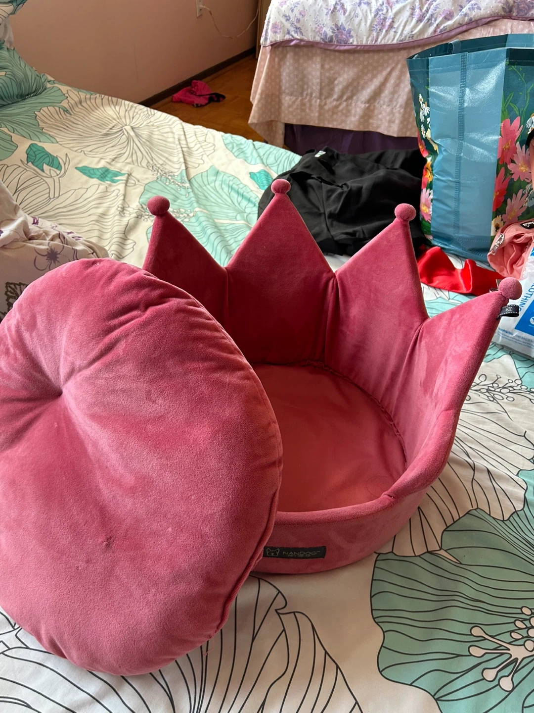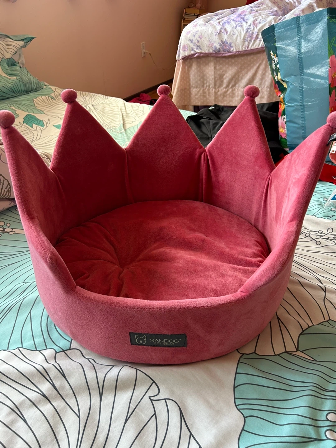 This adorable pink crown-shaped pet bed from Nandog is super soft and cozy. It's perfect for small dogs or cats who love to feel like royalty! Measures approximately 18 inches wide and 10 inches tall. Removable inner cushion.