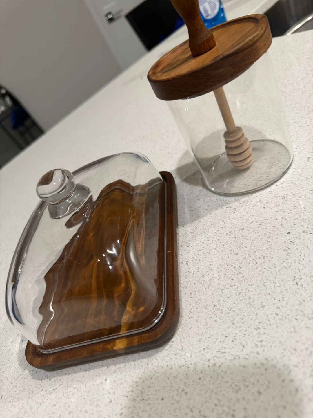Stylish glass butter dish featuring a wooden base and matching lid. It's designed to keep your butter fresh. Also includes a glass honey pot with a wooden dipper and lid. Perfect for serving butter and honey at the table!