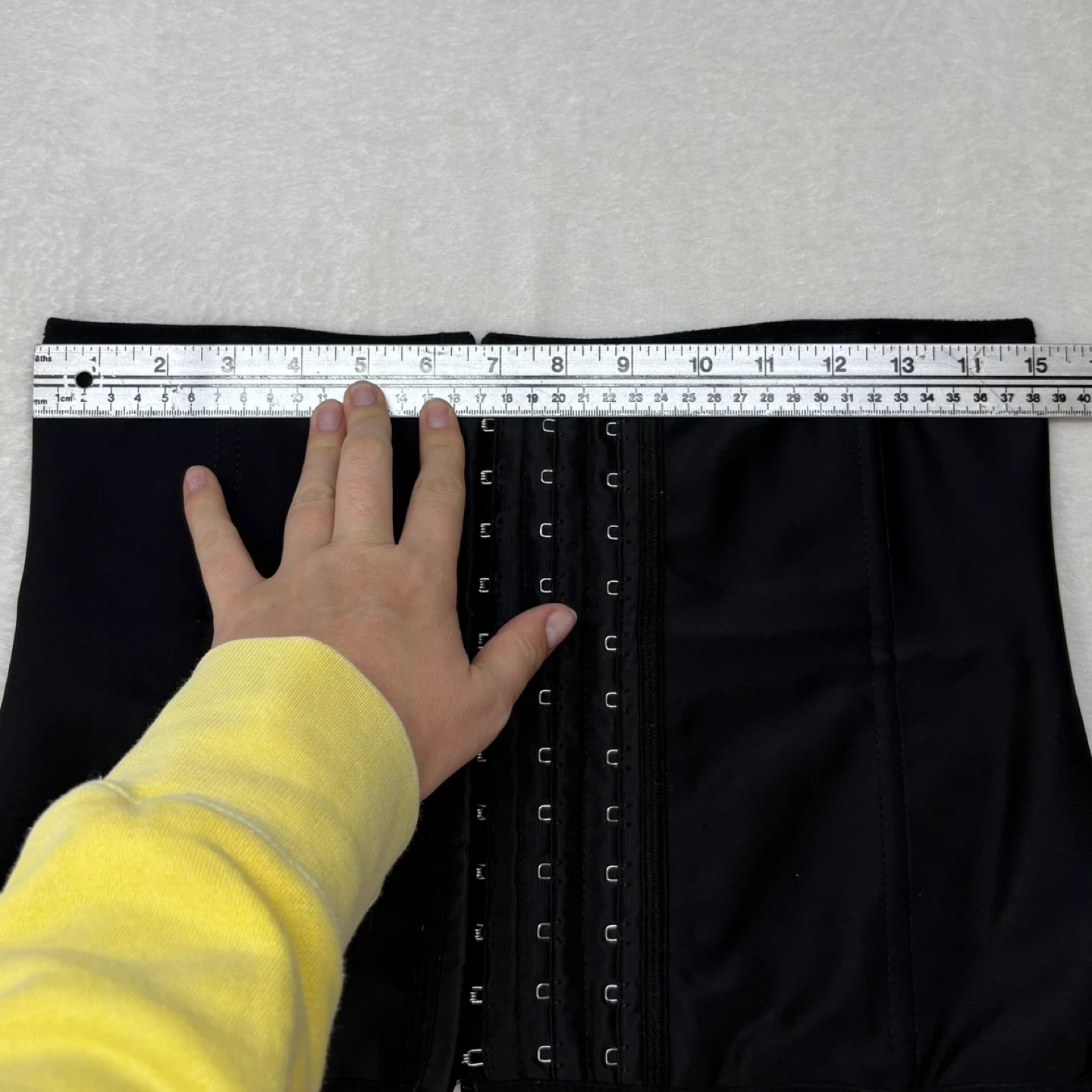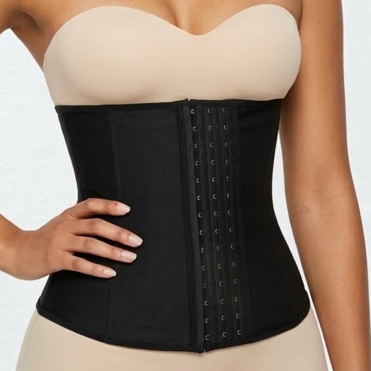 This high-compression waist cincher features a matte solid exterior with three rows of hook-and-eye closures and internal steel boning for structure.