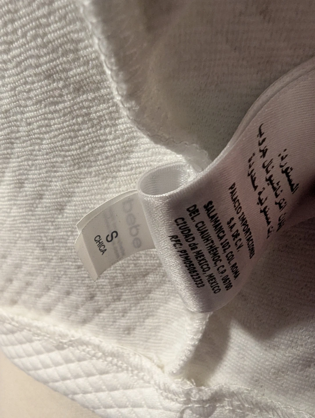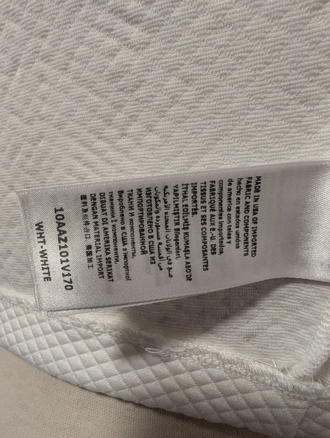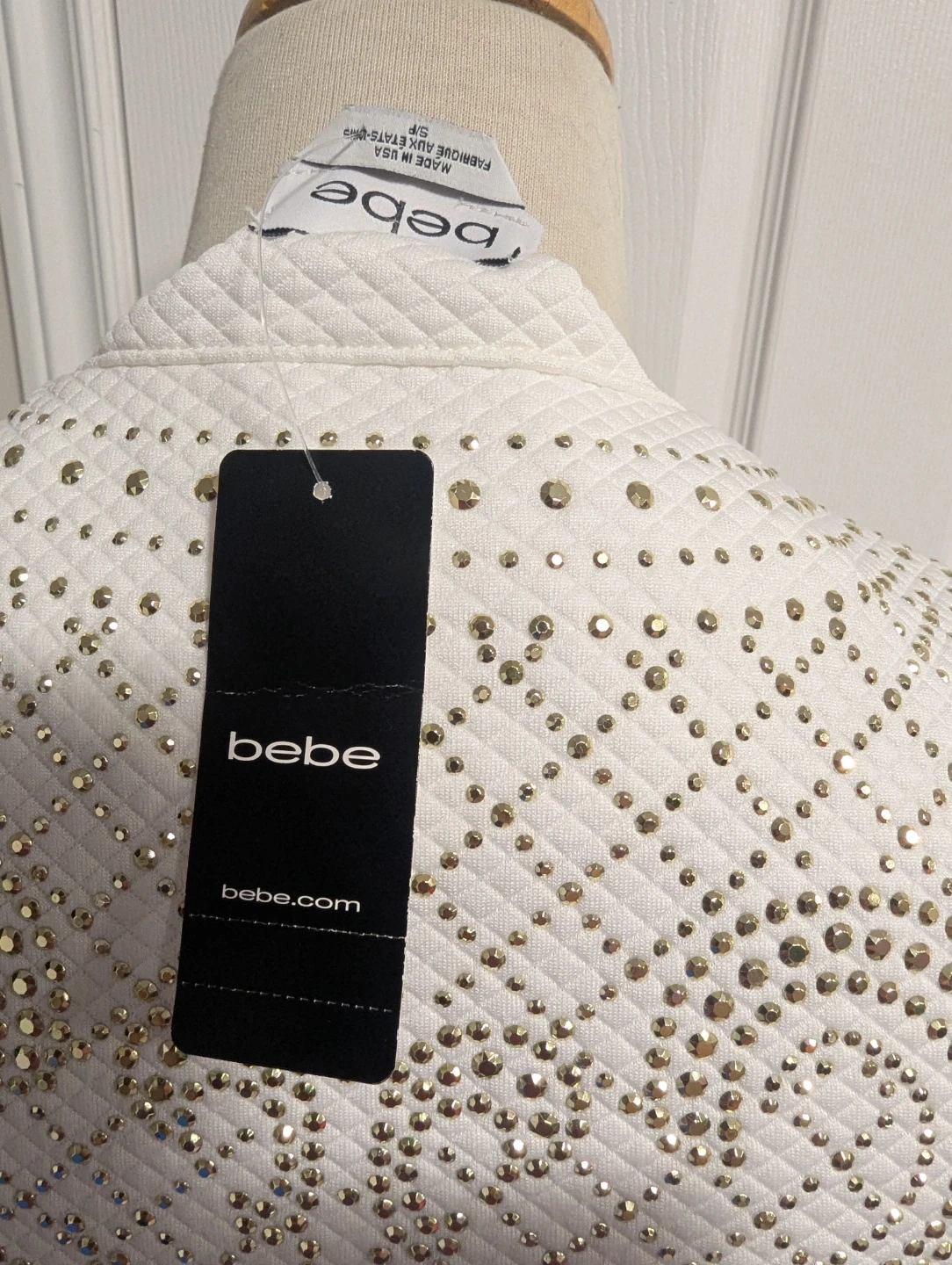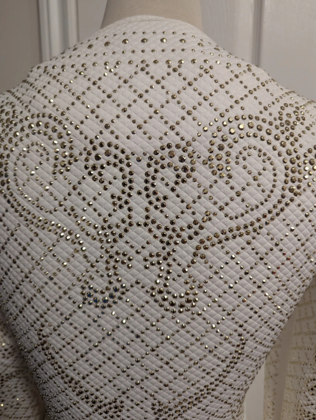White cropped jacket covered in intricate silver and gold embellishments. Features a zip-up front closure and long sleeves. This stylish jacket is perfect for adding a touch of sparkle to any outfit!