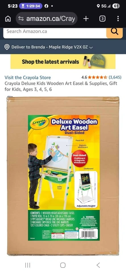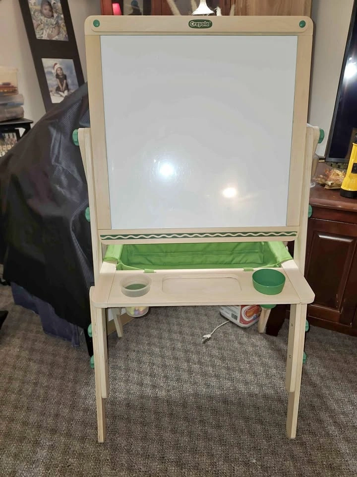 This is a used Crayola Deluxe Wooden Art Easel that has been restored and is ready for a new home. It's sturdy and height-adjustable, perfect for your little artist. It includes the easel, 2 paint pots (1 added), an eraser, used chalk, and a fabric bag. The dual-sided board features a magnetic dry-erase side and a chalkboard.
