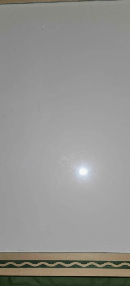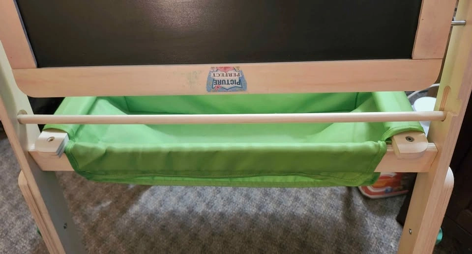 Some noted cosmetic details: the magnetic dry-erase board has minor scratches that don't affect use (see photo). The chalkboard had a sticker removed, leaving some old paint stains (see photo). Green waves were added to the chalkboard with a paint pen and have very light smudging from the sealant (see photo). A new paper roll holder was created as the original was missing (see photo). The knobs to switch between the board sides don't tighten fully but hold the chalkboard in place.