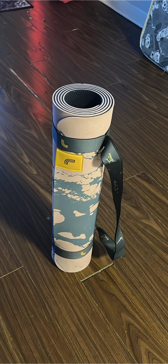 This yoga mat has a camouflage-inspired design. It comes with a convenient carrying strap for easy transport. The mat appears to be made of a durable material suitable for workouts.