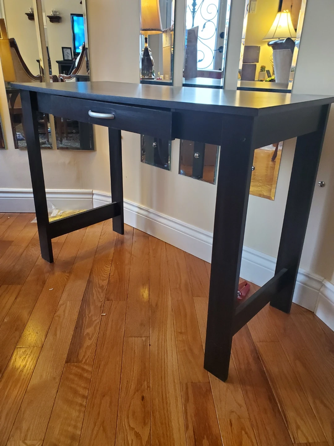 Selling a black wooden desk with a drawer. It's in good condition and perfect for a home office or study space. The desk has a simple, clean design that will fit well with any decor.