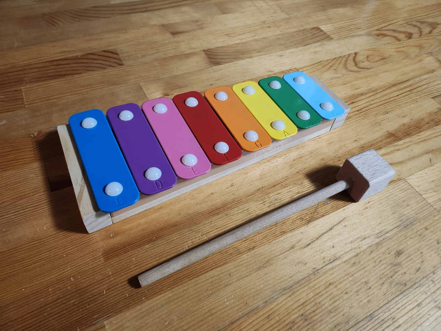 - Playing: Hold the mallet lightly by the handle and strike the center of the colored metal bars. A quick, "bouncing" strike will produce a clearer, ringing tone than a heavy, lingering strike.
