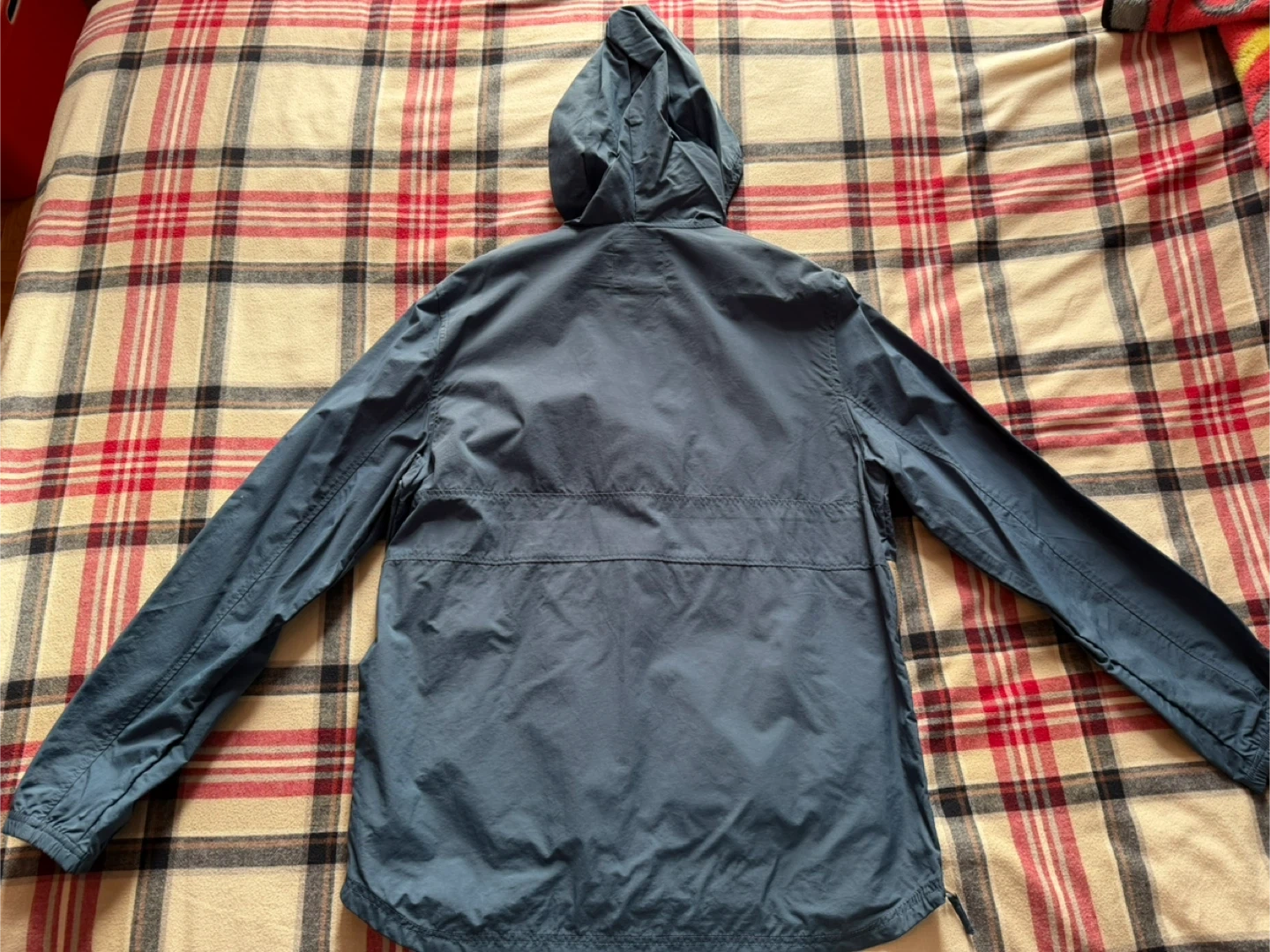 Lightweight blue pullover jacket with a hood. It features a half-zip closure and a front pouch pocket in addition to two side pockets. Made from durable material.