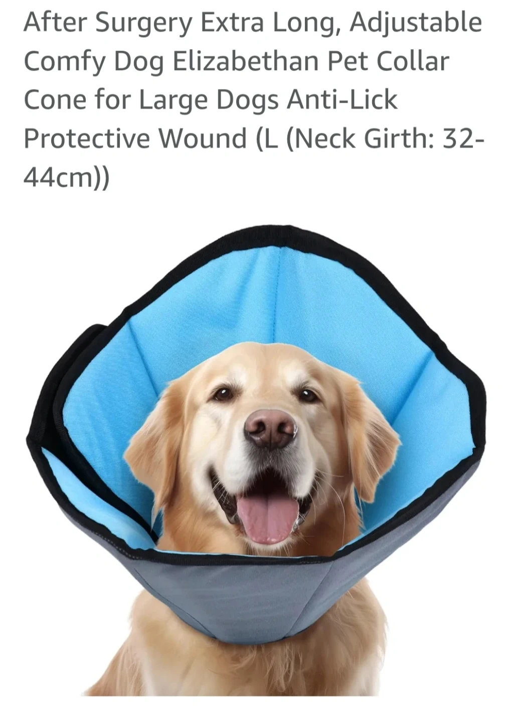 This is an extra-long, adjustable comfy dog Elizabethan pet collar cone, perfect for large dogs! It's designed to be anti-lick and protective for wounds.