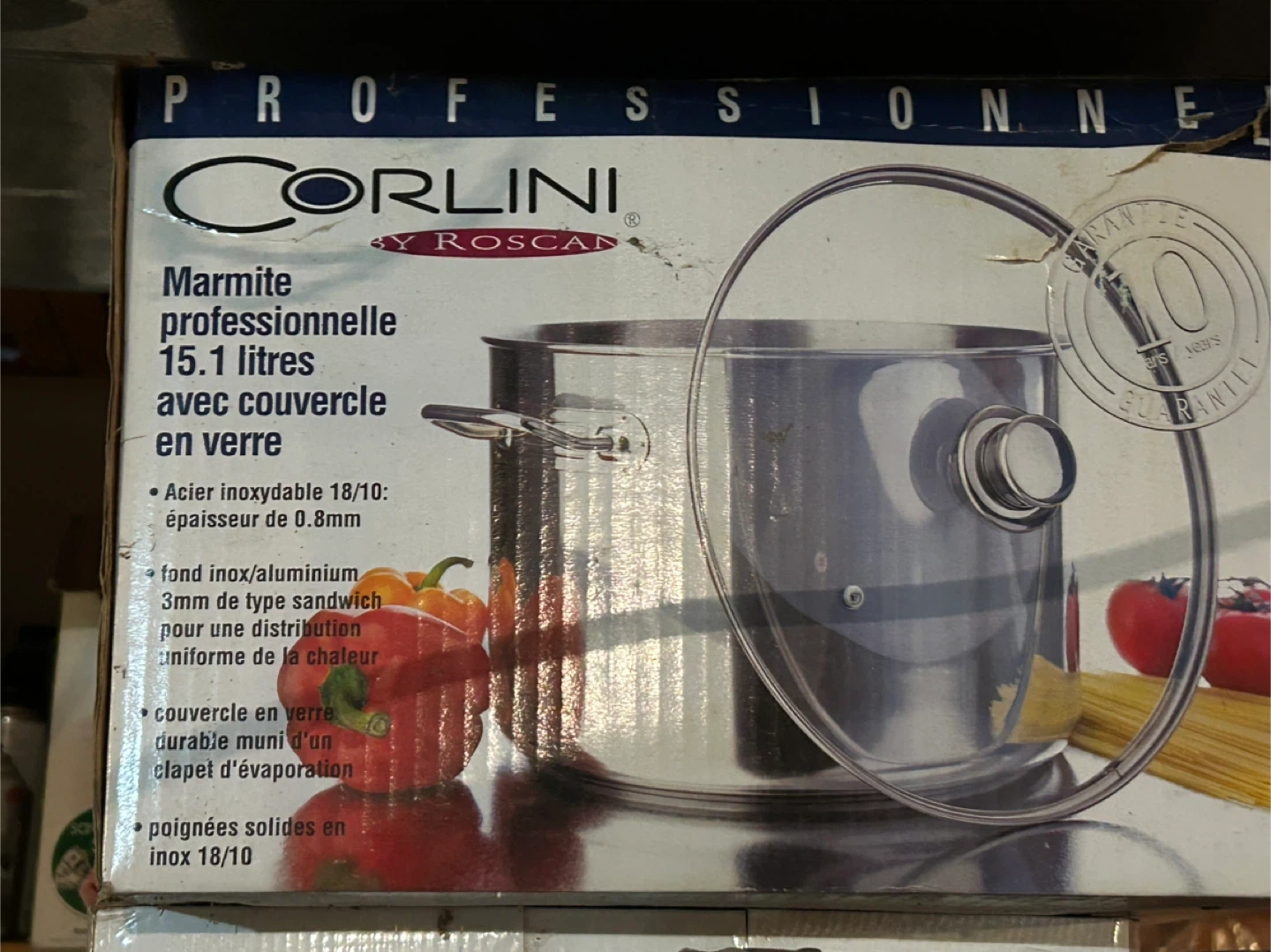 This Corlini professional stock pot has a 15.1-litre capacity and comes with a glass lid. It's made from 18/10 stainless steel with a 0.8mm thickness and features a 3mm sandwich base for even heat distribution. The solid 18/10 stainless steel handles provide a secure grip.
