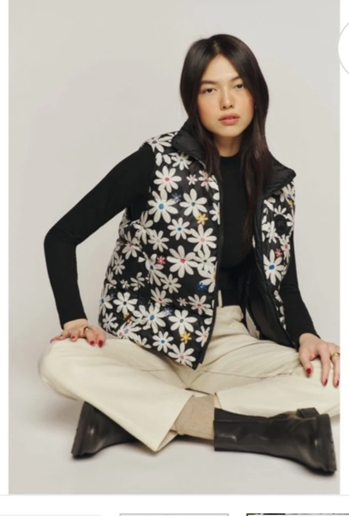 This reversible vest features a black puffer exterior and a vibrant floral print on the interior lining and collar. It's designed for warmth and style.