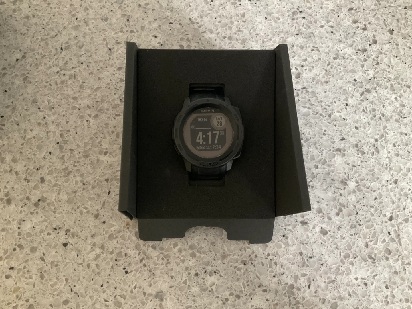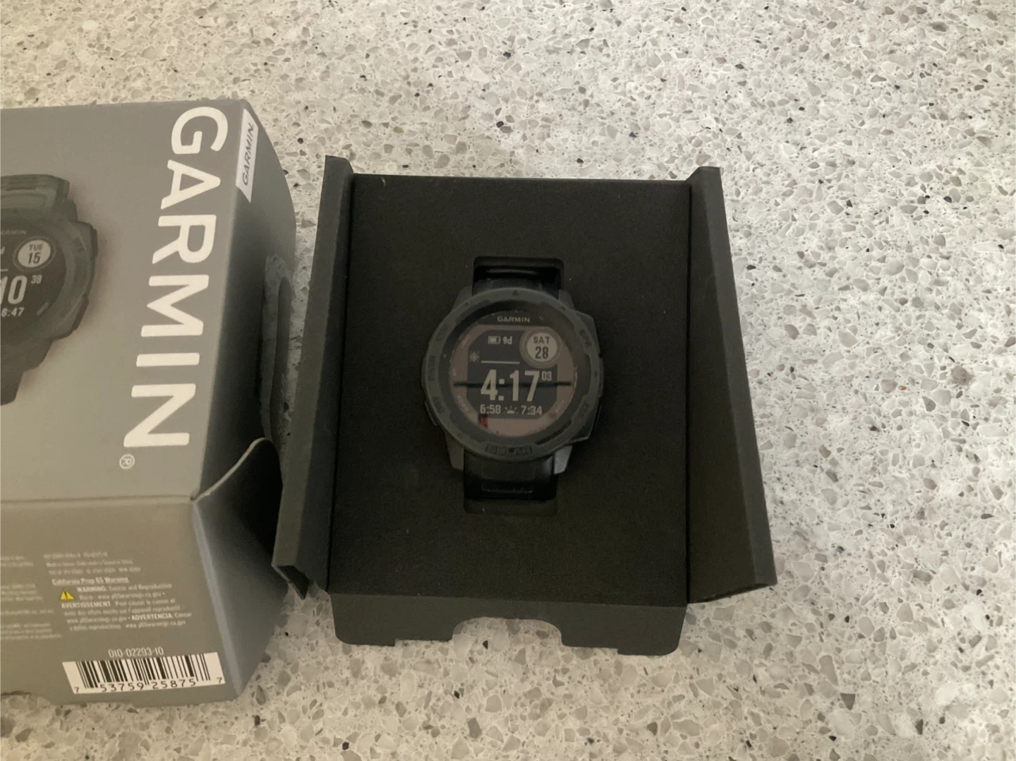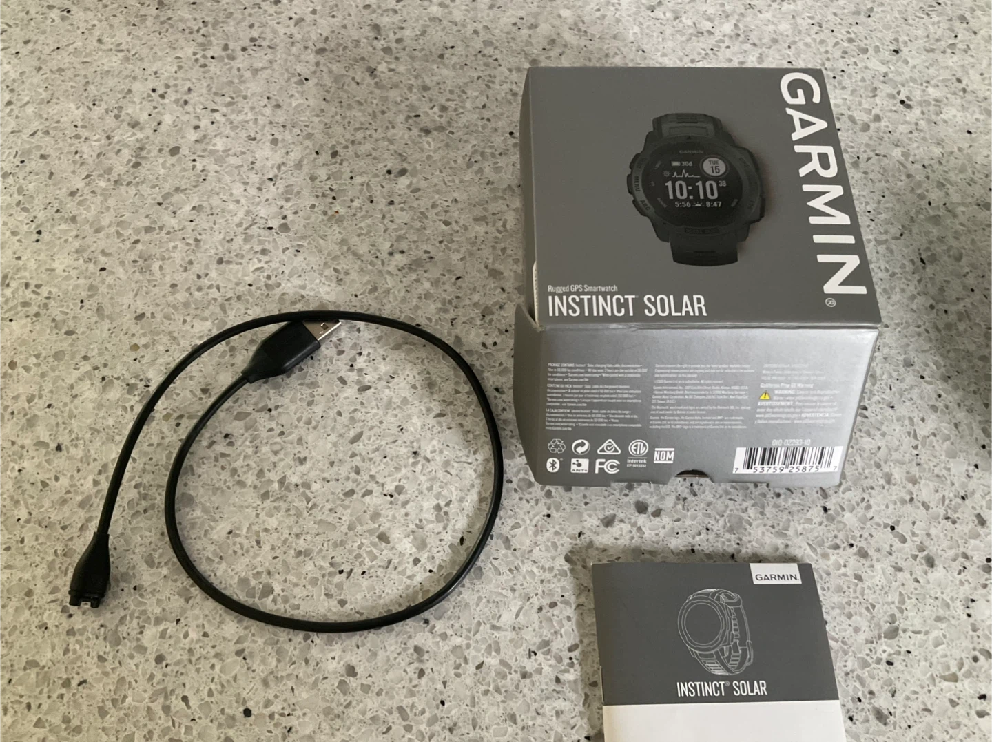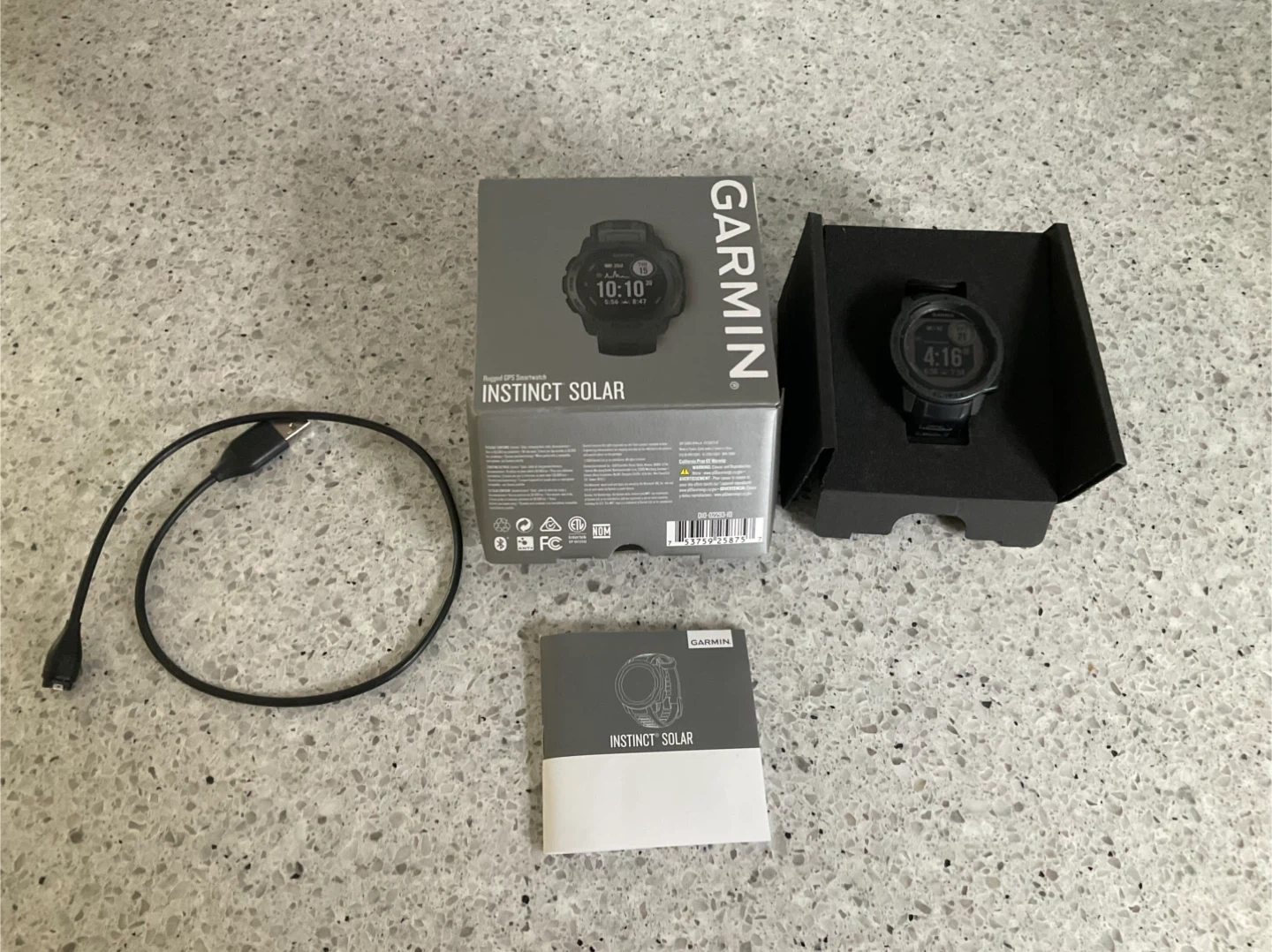 This Garmin Instinct Solar is a rugged GPS smartwatch. It comes with its original box, charging cable, and manual. It's built for durability and outdoor adventures. New Watch band!!!
