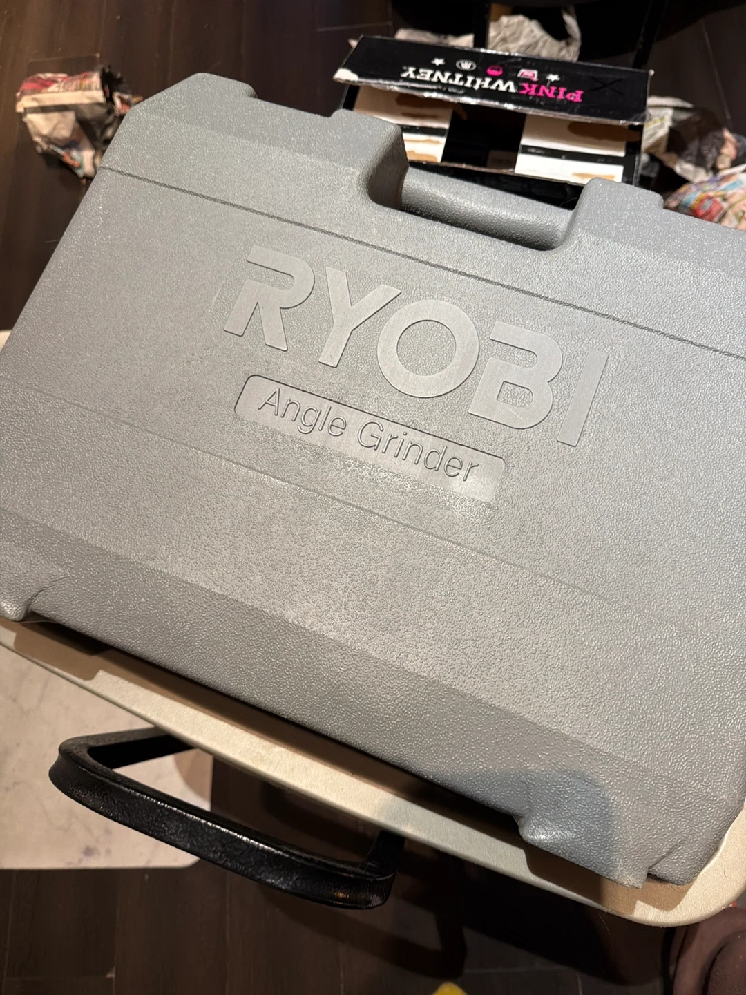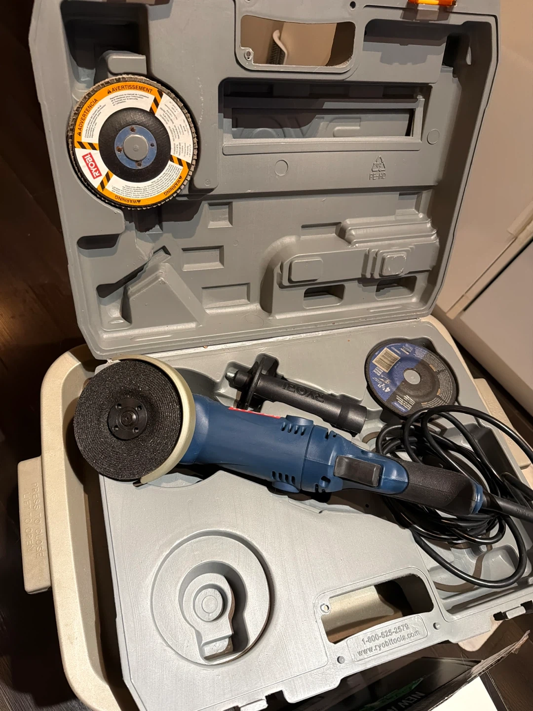 Never used, practically vintage but brand new Ryobi angle grinder kit. Kept inside in a closet, no damage. It comes with the grinder, handle, and two cutting discs. All components fit neatly into the included carrying case.
