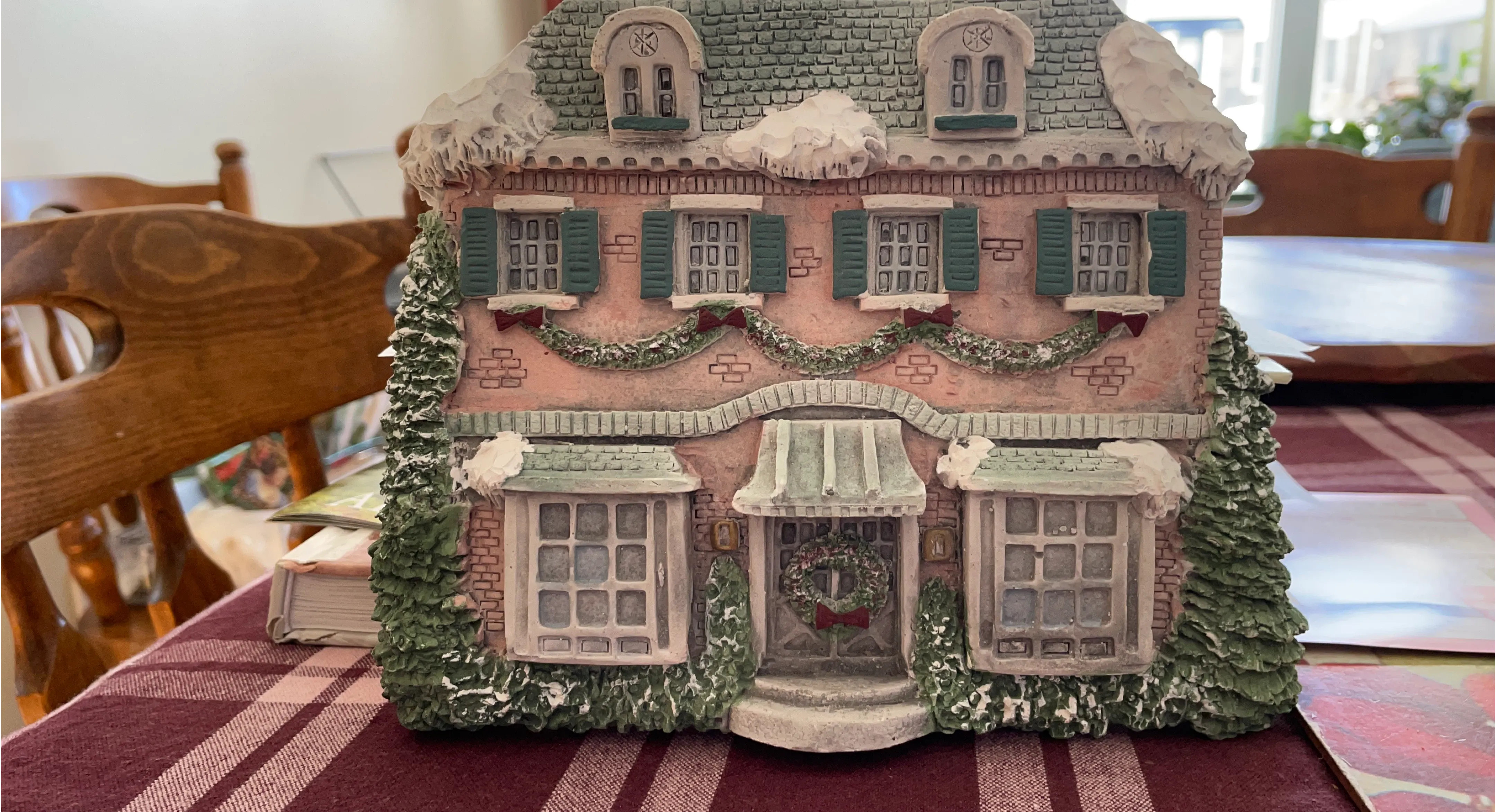 Charming decorative house for your holiday display. It features festive greenery and snow accents! A lovely piece to add to your Christmas village collection.