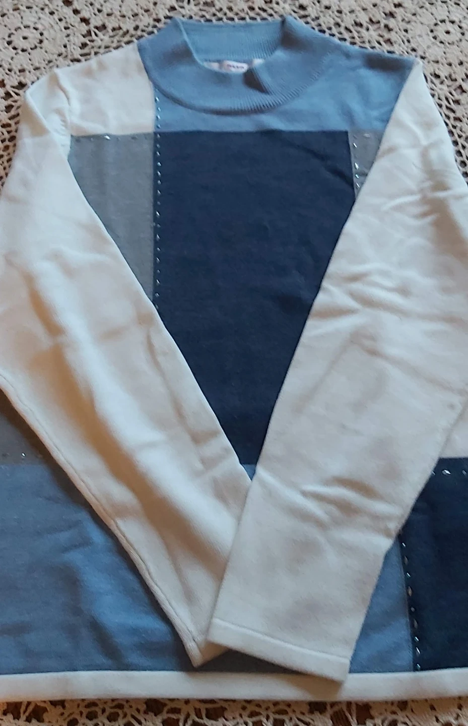 This Alia Petite sweater features a unique patchwork design. It's made with a blend of 60% cotton and 40% acrylic. This would be a nice casual addition to your wardrobe!