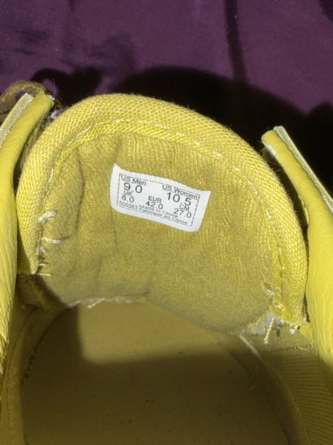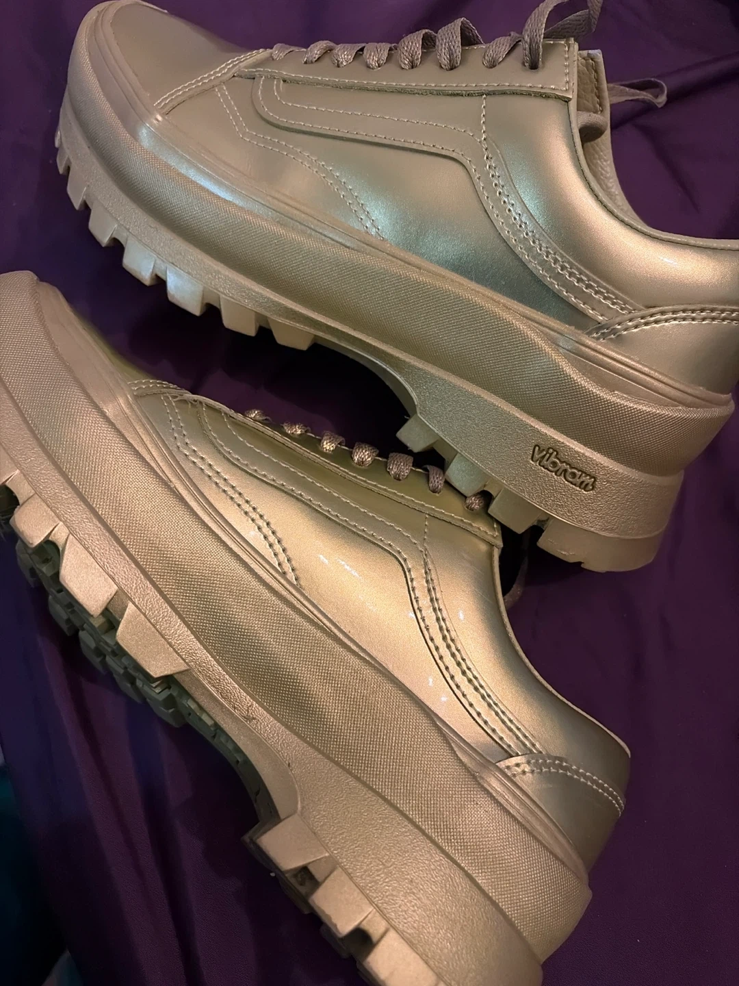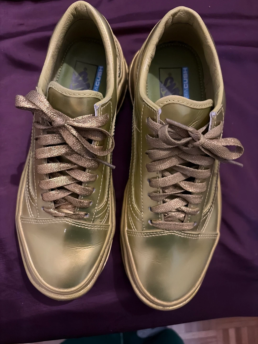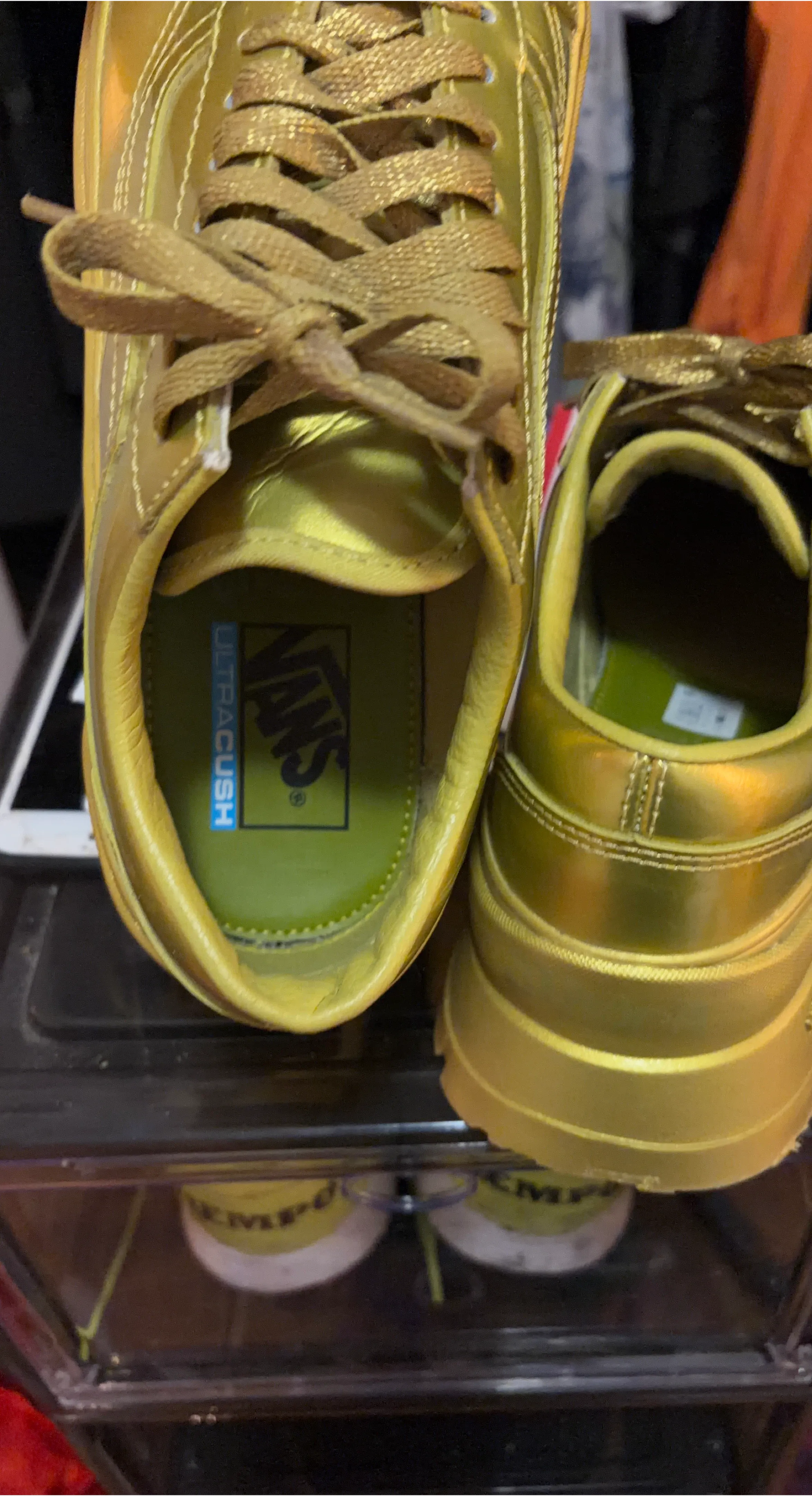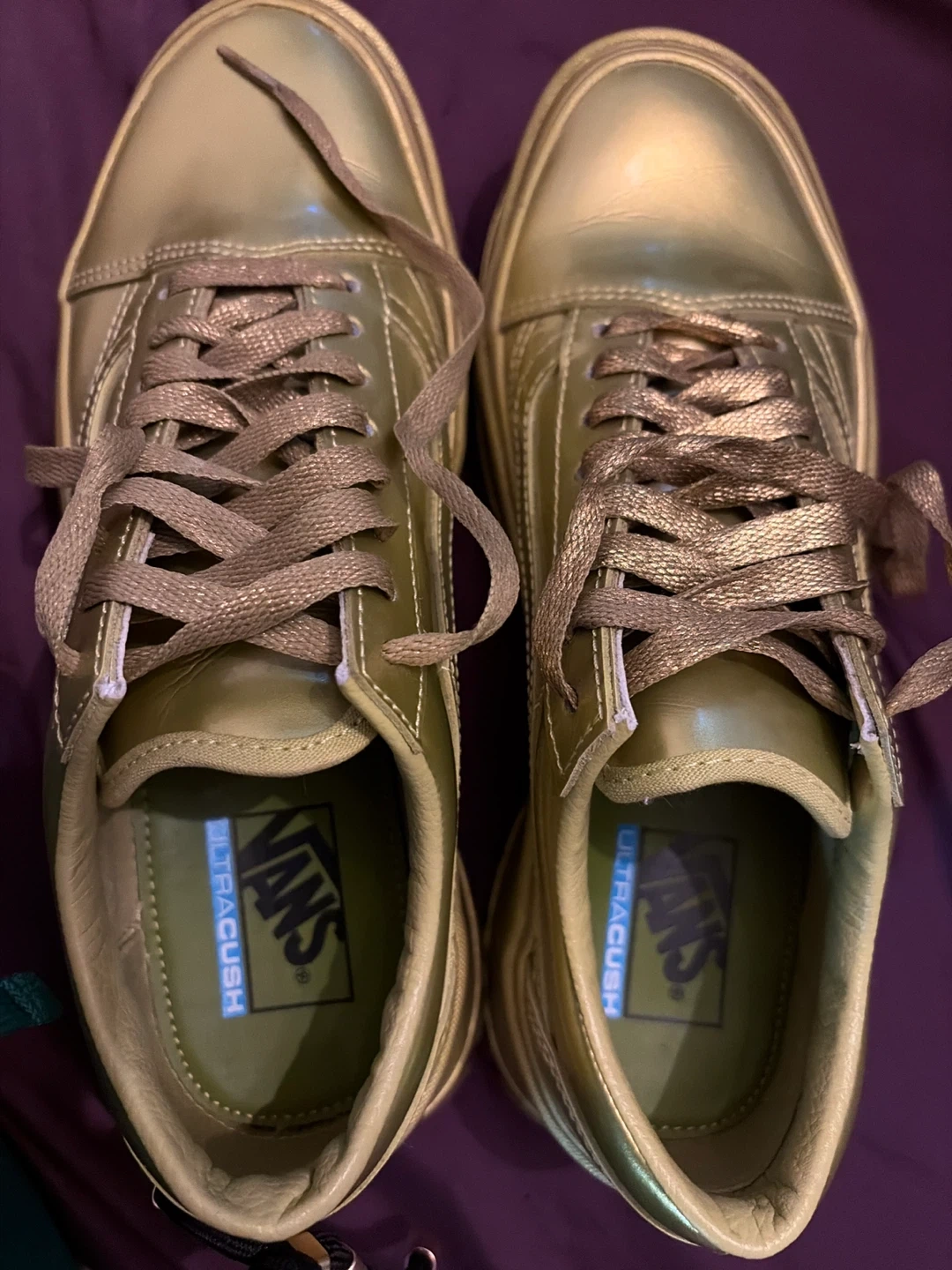 These Vans sneakers are a shiny gold greenish metallic colour. They feature Vans Ultracush insoles for comfort. US Men's size 9, which is a US Women's 10.5.