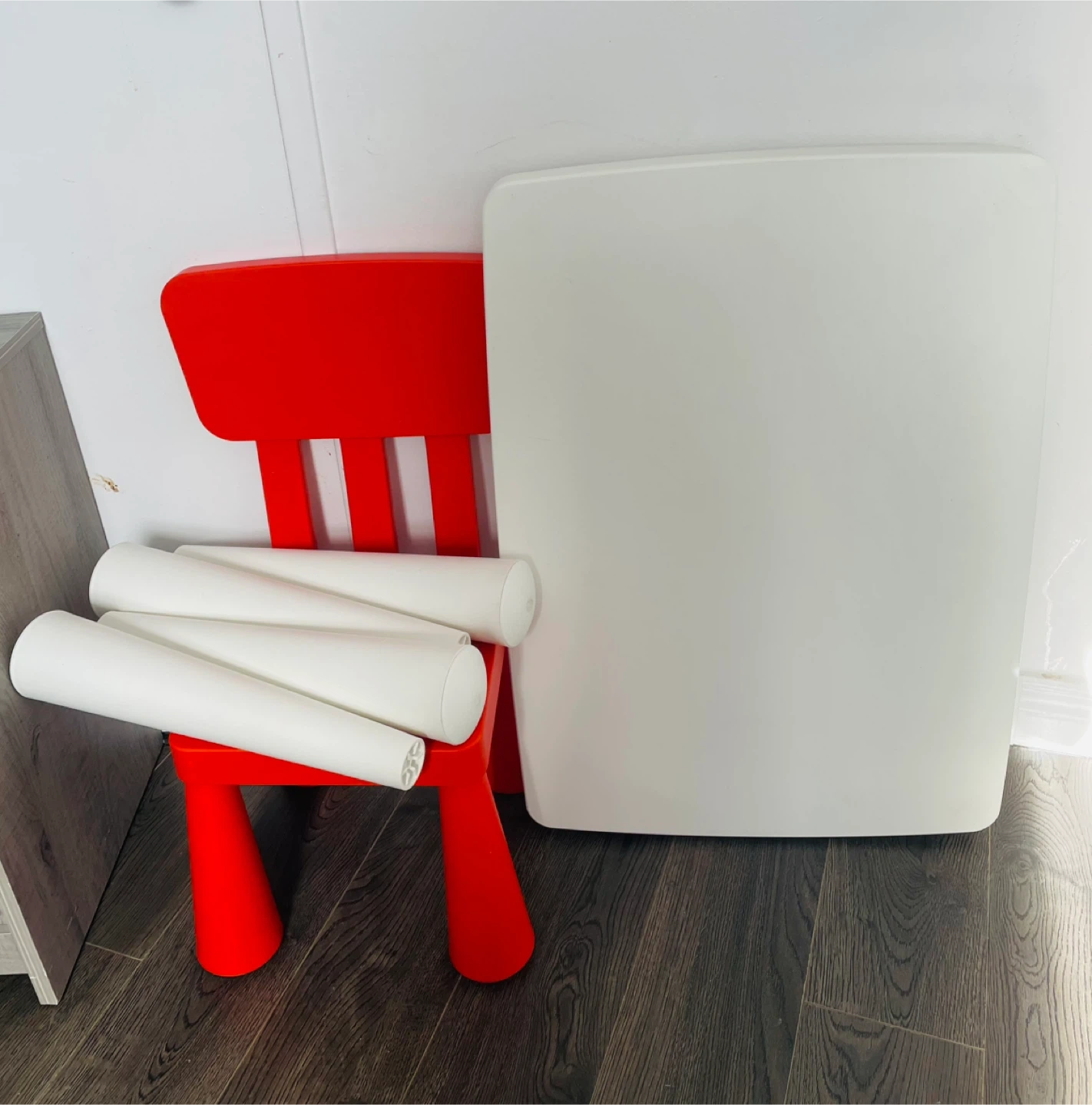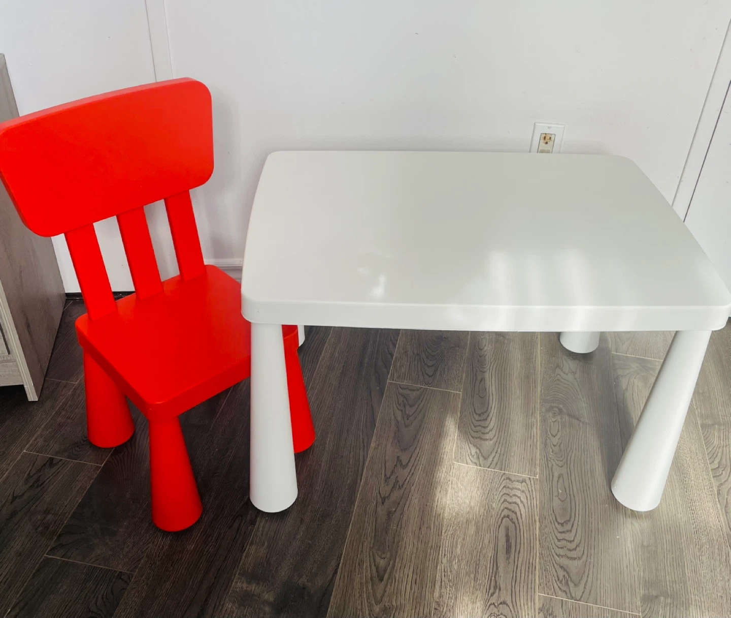 This IKEA Mammut table and chair set is perfect for little ones! The set includes one bright red chair and a white table. Made from durable, moulded plastic, it's easy to wipe clean. Great for arts, crafts, or snack time!