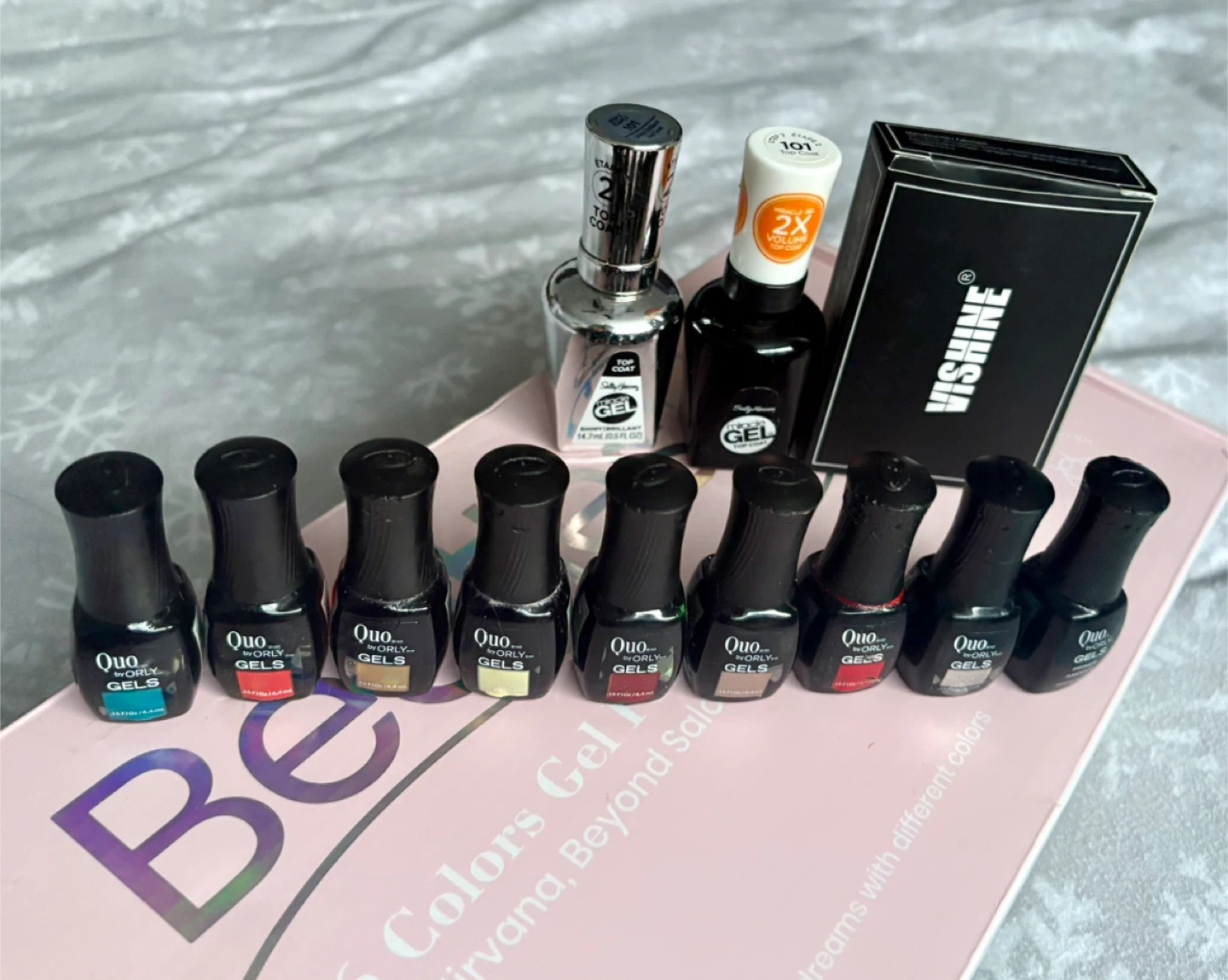 A collection of Quo by Orly gel nail polishes, featuring various colours and a top coat. Each polish is 4.4ml (0.15 US FL. OZ.). Set includes 8 gel polishes and 2 top coats.