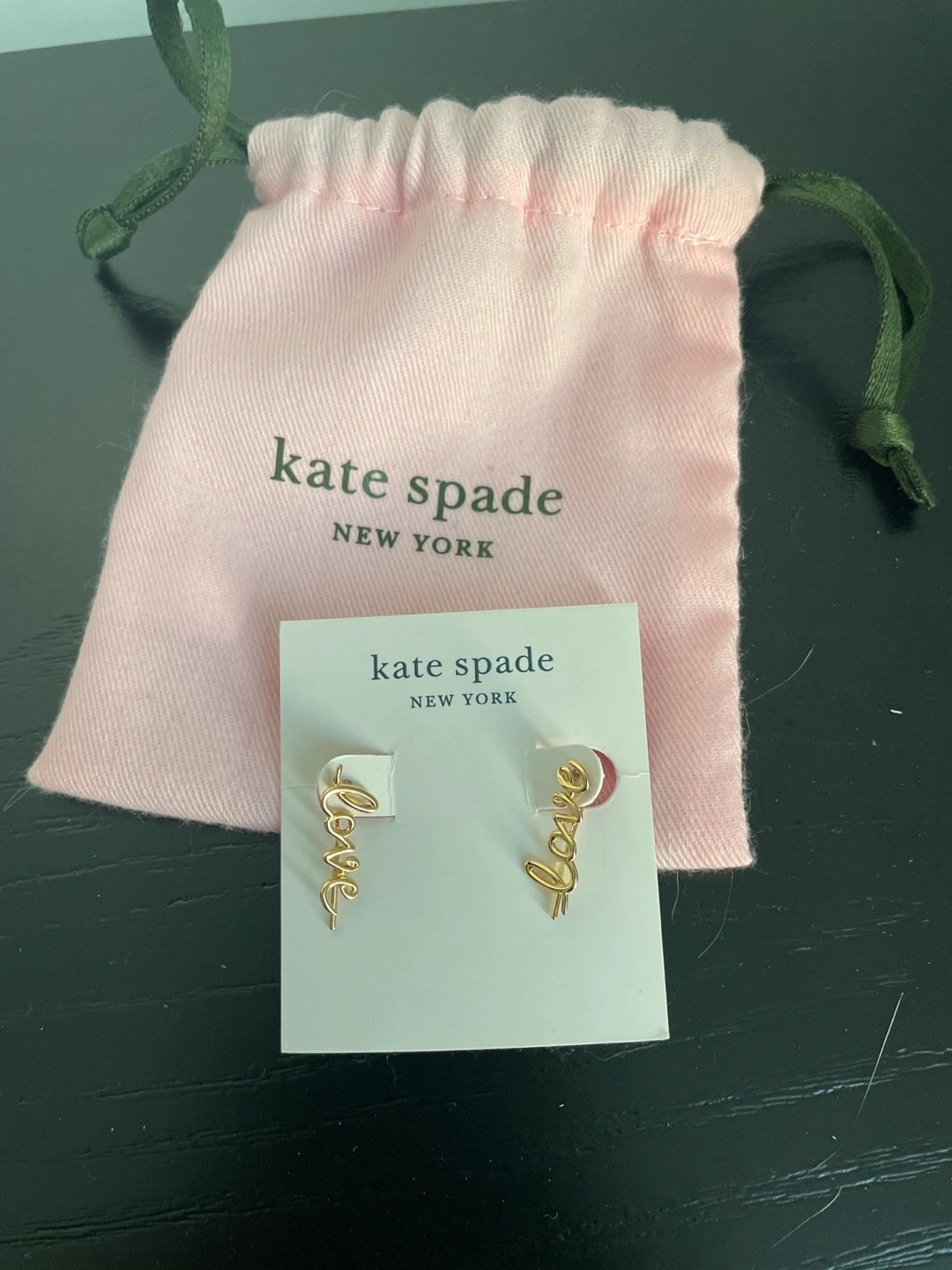 Gold-tone earrings. 'Love' script design. Come in a Kate Spade dust bag. Very lightly used (worn a couple of times)