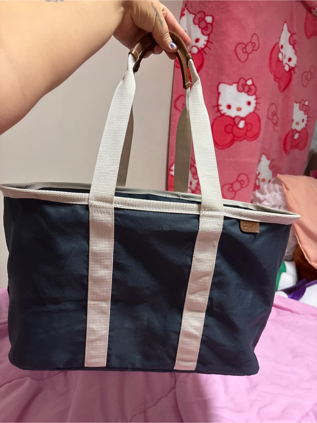 This is a CM tote bag with cream coloured webbing straps and brown leather accents on the handles. It's a dark navy blue colour. It's a sturdy bag, great for carrying groceries or everyday essentials.